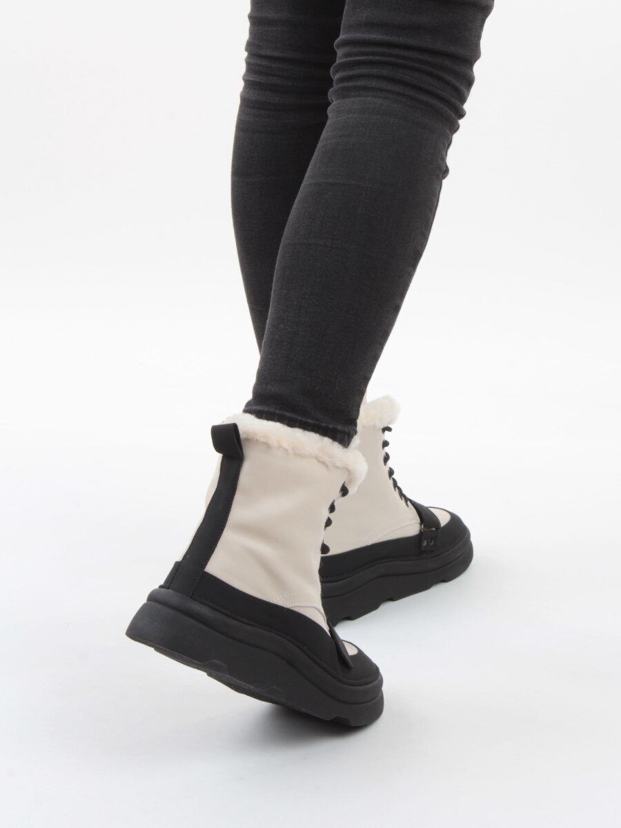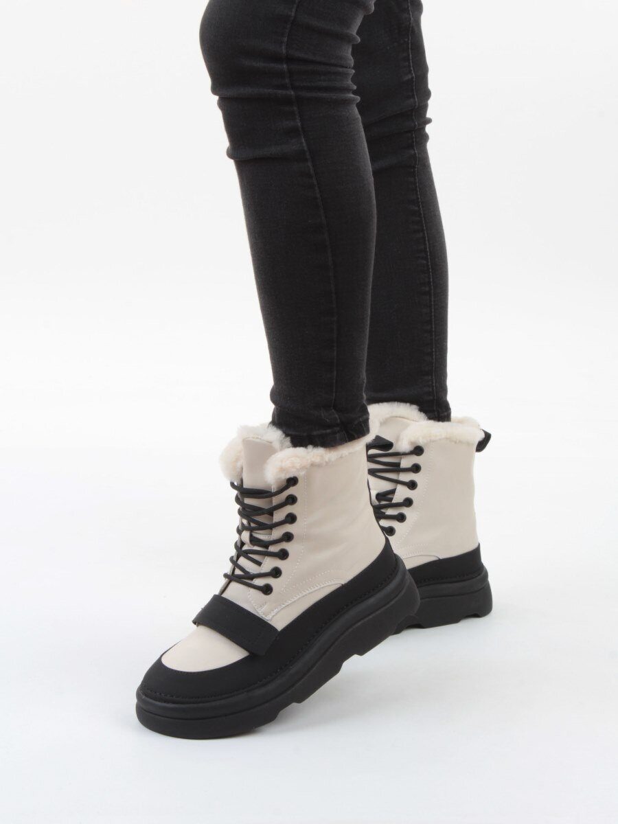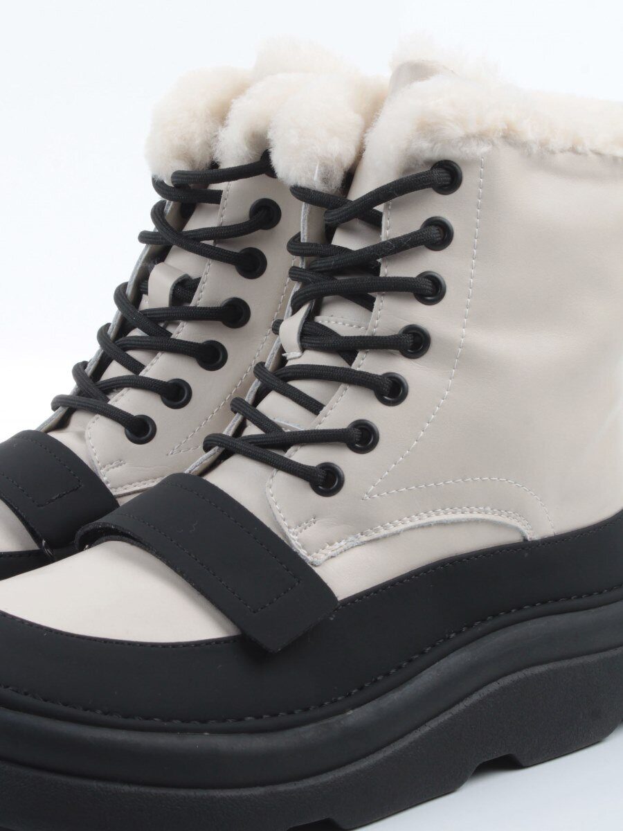Светло-бежевый с черным Ботинки зимние женские (натуральная кожа, натуральный мех, 100% шерсть)