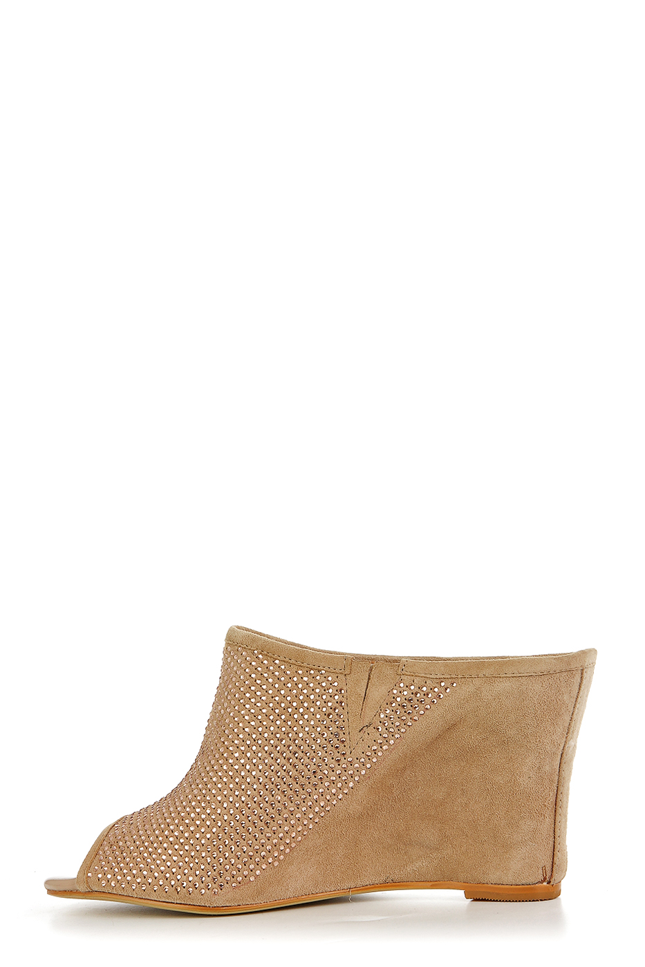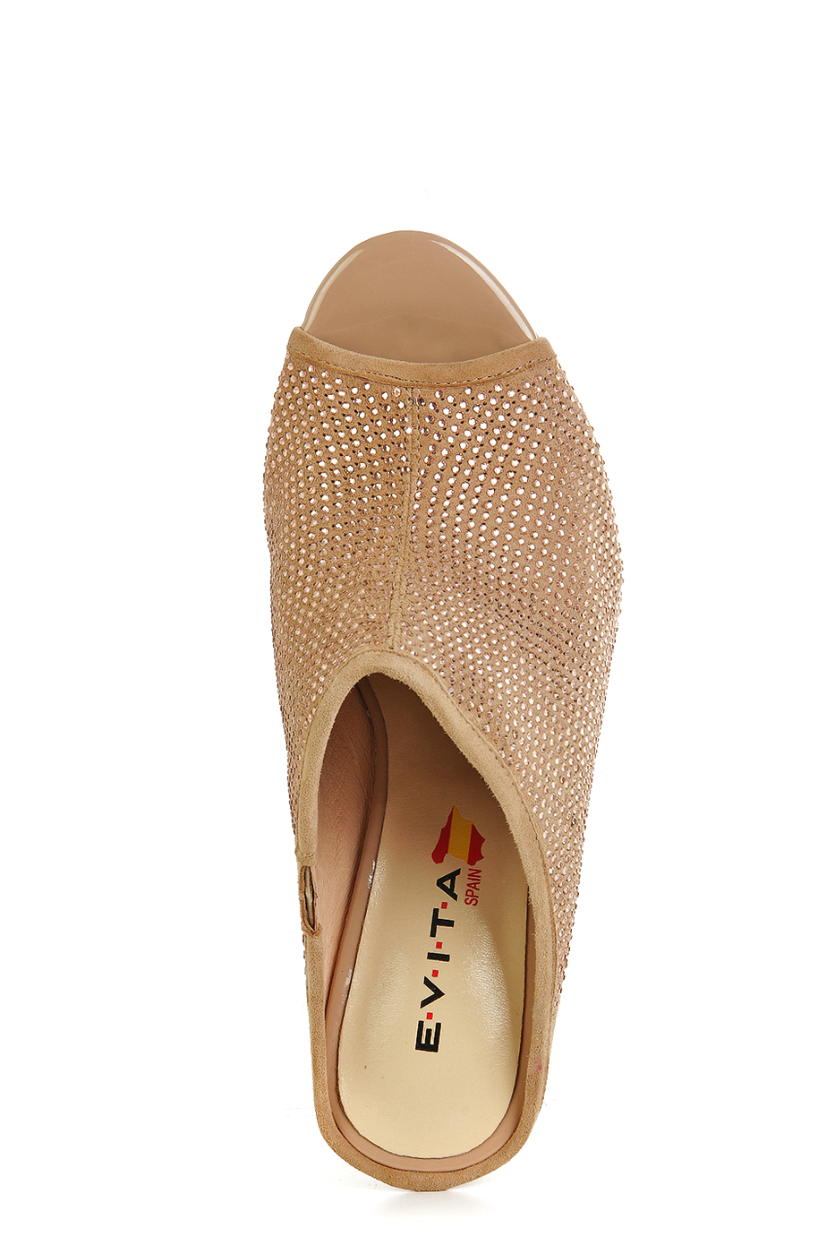 Очаровательные сабо от EVITA. Верх модели выполнен из натурального велюра. Скрытая резинка отвечает за удобную посадку на ноге. Высокая танкетка не сковывает движений.
