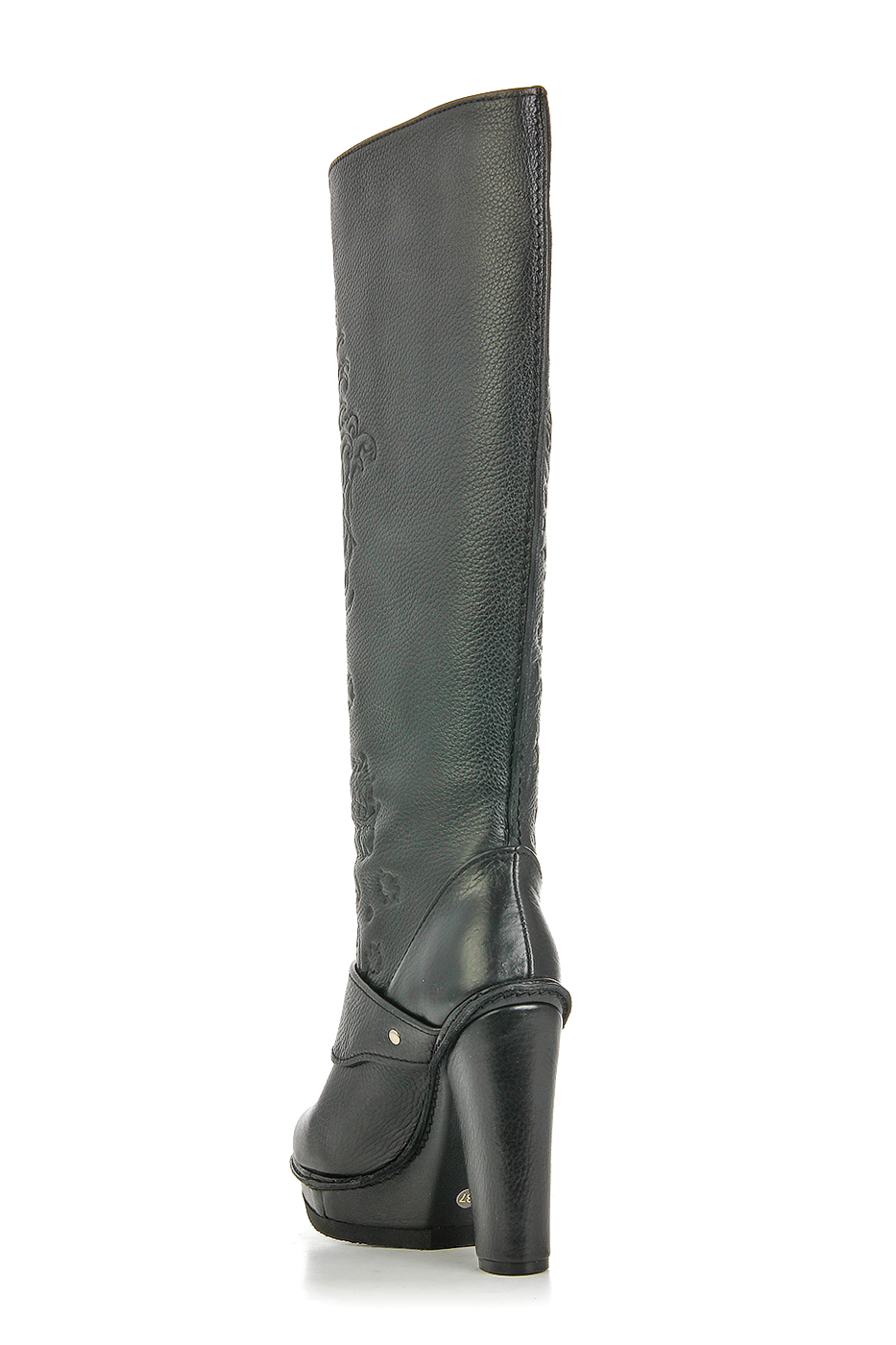 Роскошные сапоги от Jean Paul Gaultier. Верх модели исполнен из черной плотной кожи и оформлен ремешком с серебристой заклепкой и потрясающе красивым тиснением по всей высоте голенища. Отсутствие застежки компенсирует широкое голенище. Внутри - отделка из кожи. Довольно устойчивый каблук компенсируется небольшой платформой.