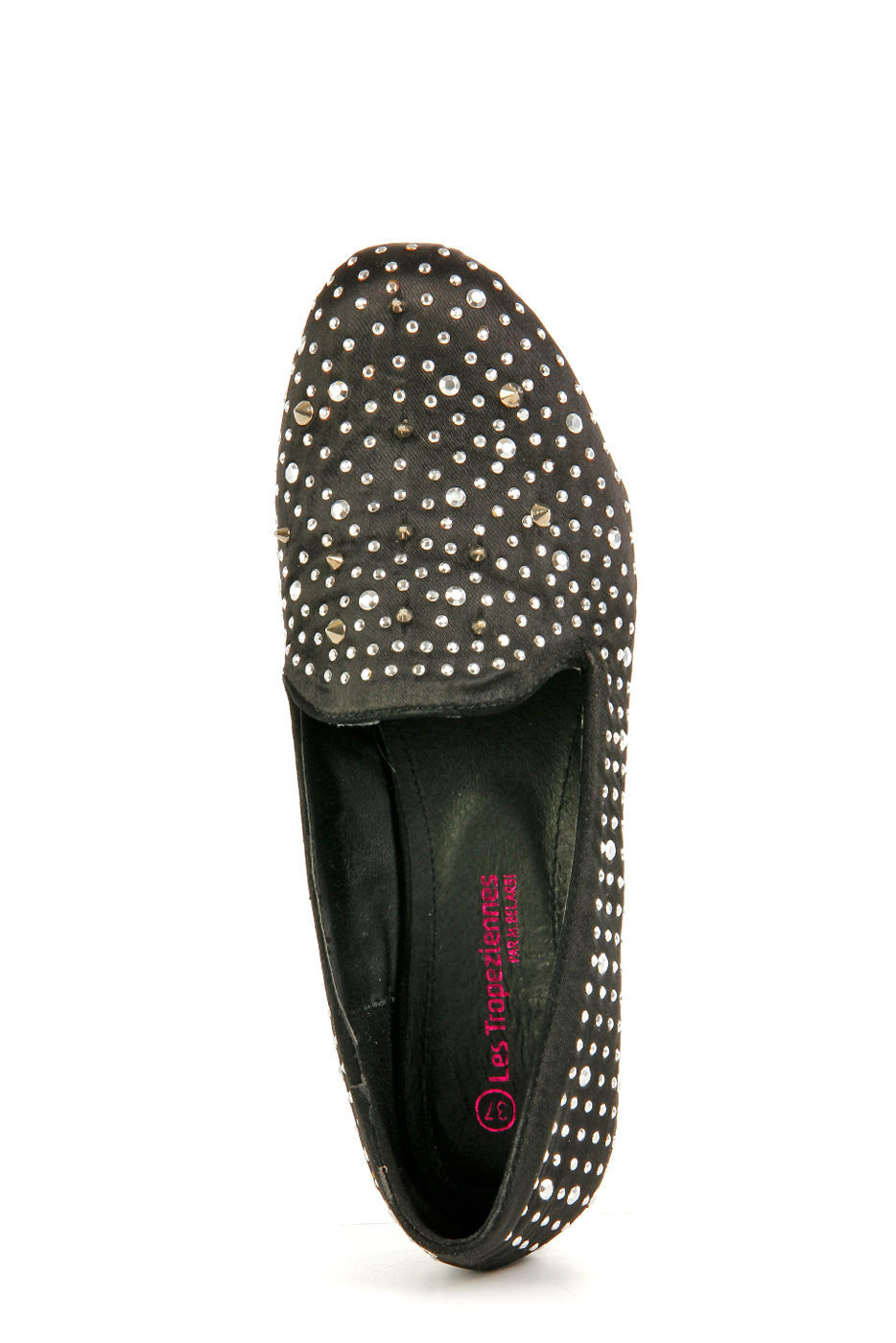 Эти эффектные туфли от Les Tropeziennes не смогут оставить вас незамеченной. Модель исполнена из текстиля в черном цвете и декорирована серебристыми мерцающими стразами, шипами и высоким язычком. Удобная подошва и каблук дополнен рифлением. Внутри - мягкая кожаная стелька.