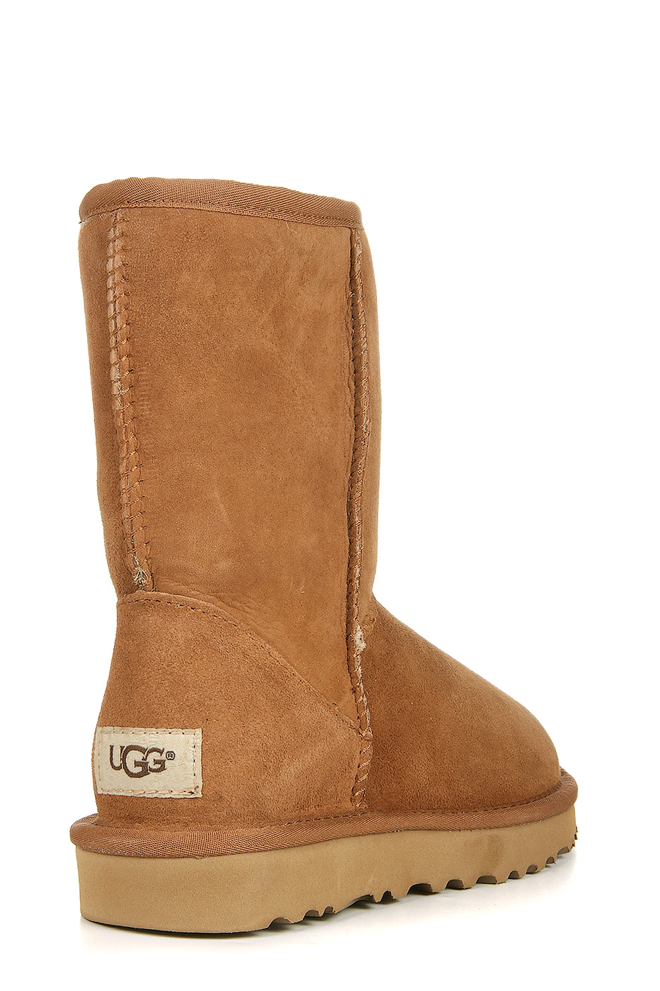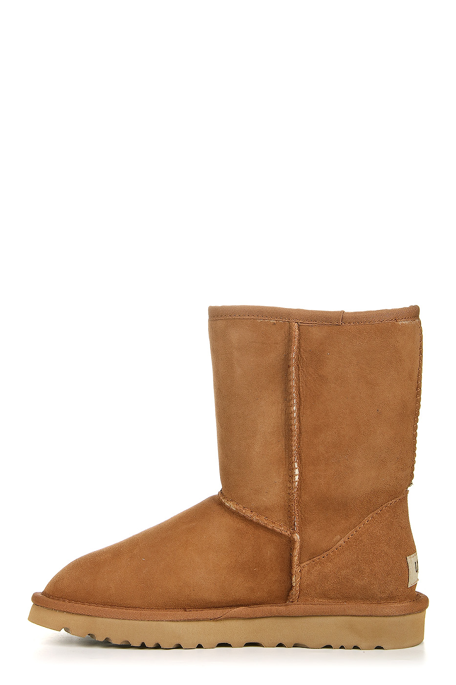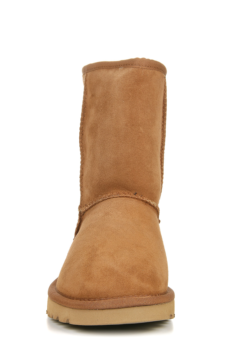 Унты выполнены из натуральной замши, верх оформлен объемными швами. Задник укреплен вставкой и дополнен логотипом бренда. Внутренняя отделка из натуральной шерсти.