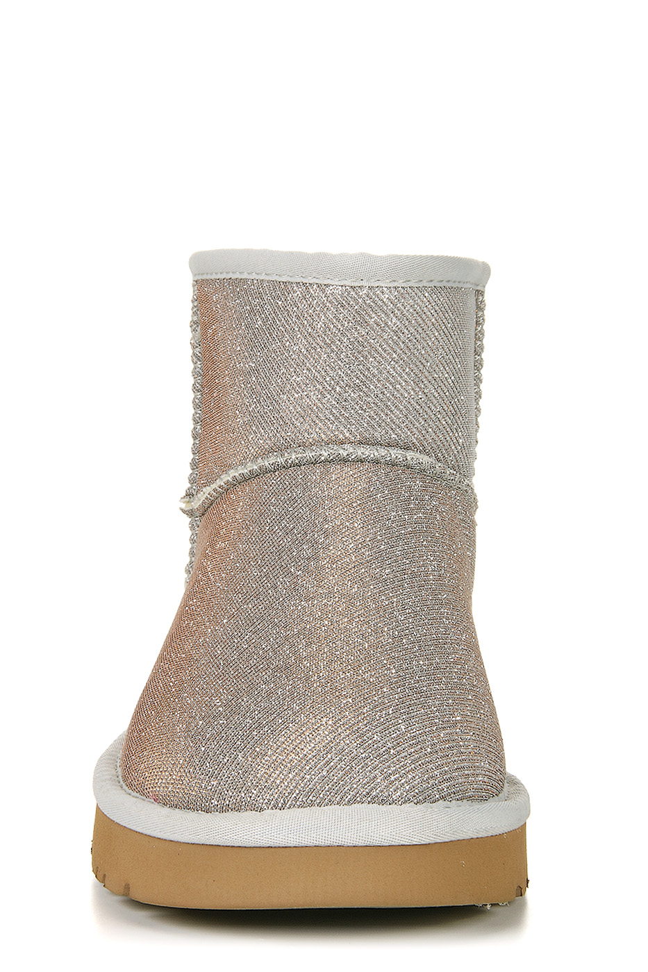 Унты выполнены из плотного текстиля, верх оформлен объемными швами. Задник укреплен вставкой и дополнен логотипом бренда. Внутренняя отделка из натуральной шерсти.