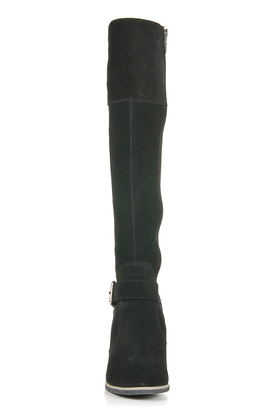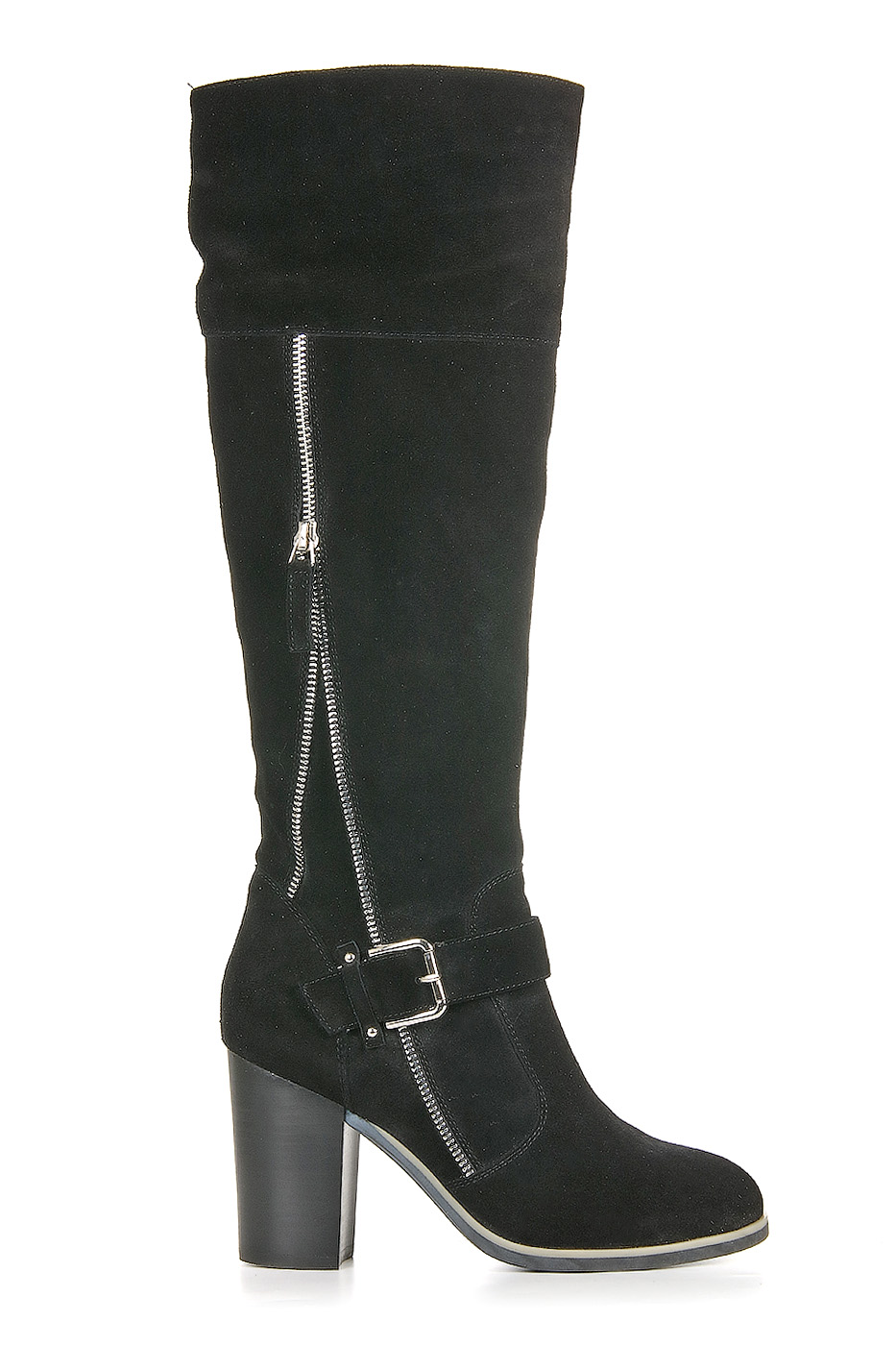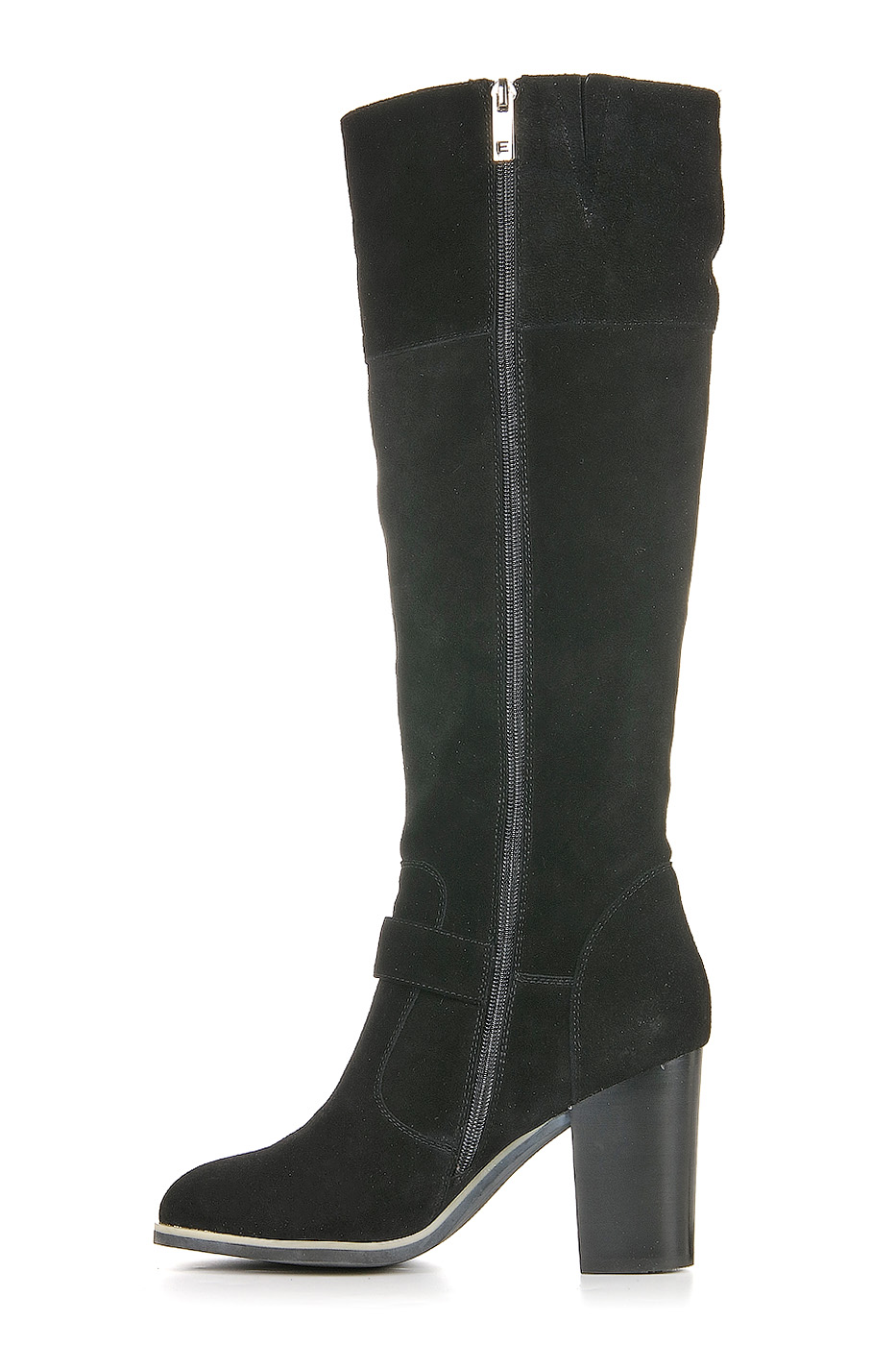 Сапоги выполнены из натурального велюра. Внутренняя отделка и стелька из байки. Детали: декоративные элементы, сбоку молния, скрытая эластичная вставка.