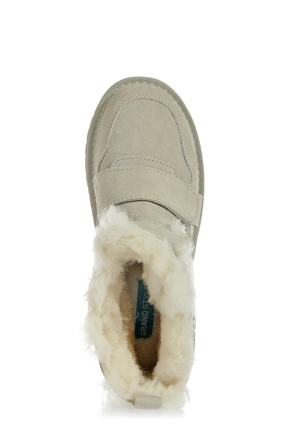 Унты выполнены из натуральной замши, верх оформлен объемными швами. Задник укреплен вставкой и дополнен логотипом бренда. Внутренняя отделка из натуральной шерсти.