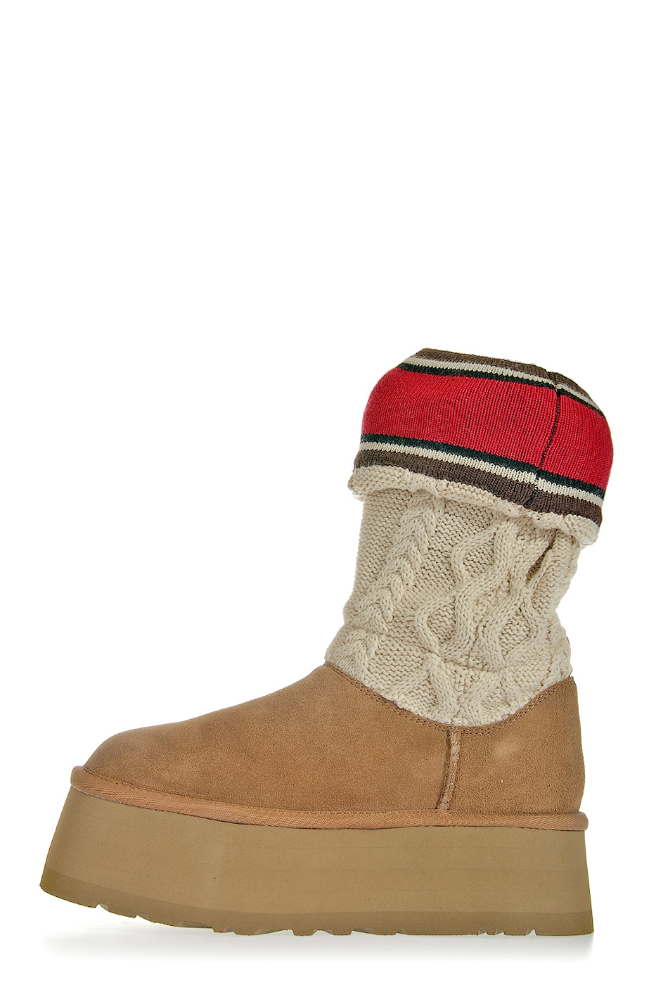 Унты выполнены из натуральной замши, верх оформлен объемными швами. Задник укреплен вставкой и дополнен логотипом бренда. Внутренняя отделка из натуральной шерсти.