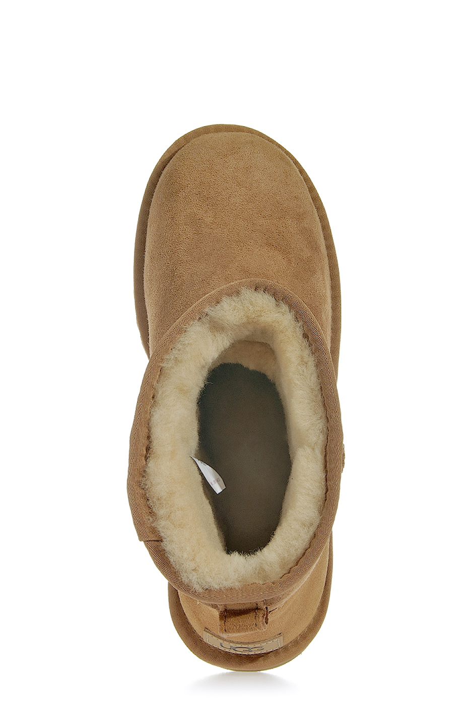 Унты выполнены из натуральной замши, верх оформлен объемными швами. Задник укреплен вставкой и дополнен логотипом бренда. Внутренняя отделка из натуральной шерсти.