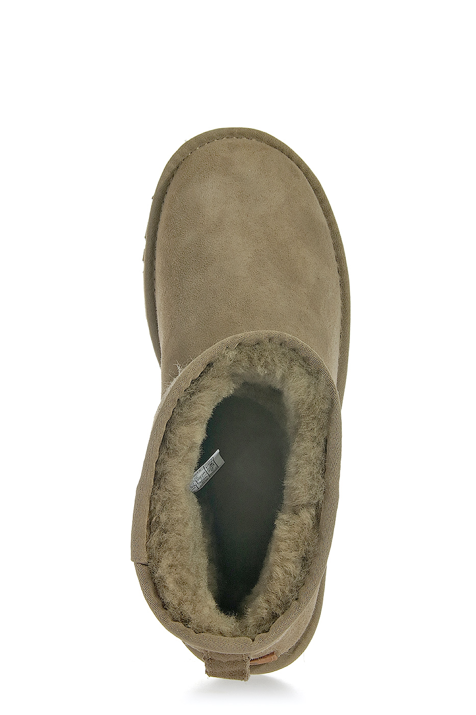 Унты выполнены из натуральной замши, верх оформлен объемными швами. Задник укреплен вставкой и дополнен логотипом бренда. Внутренняя отделка из натуральной шерсти.