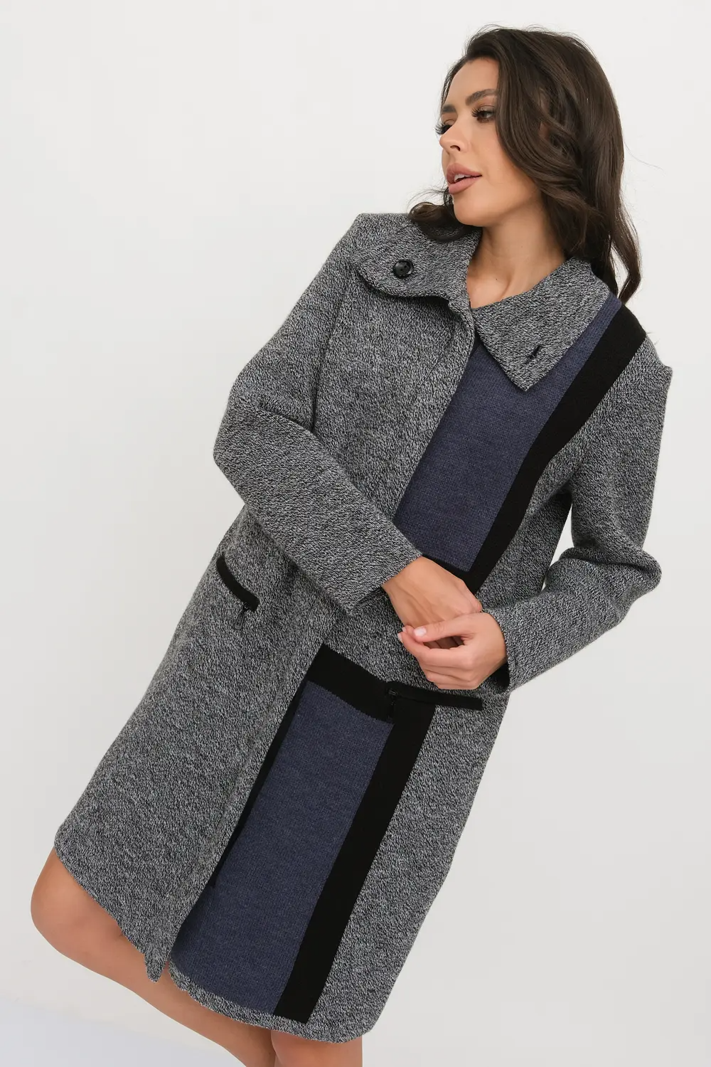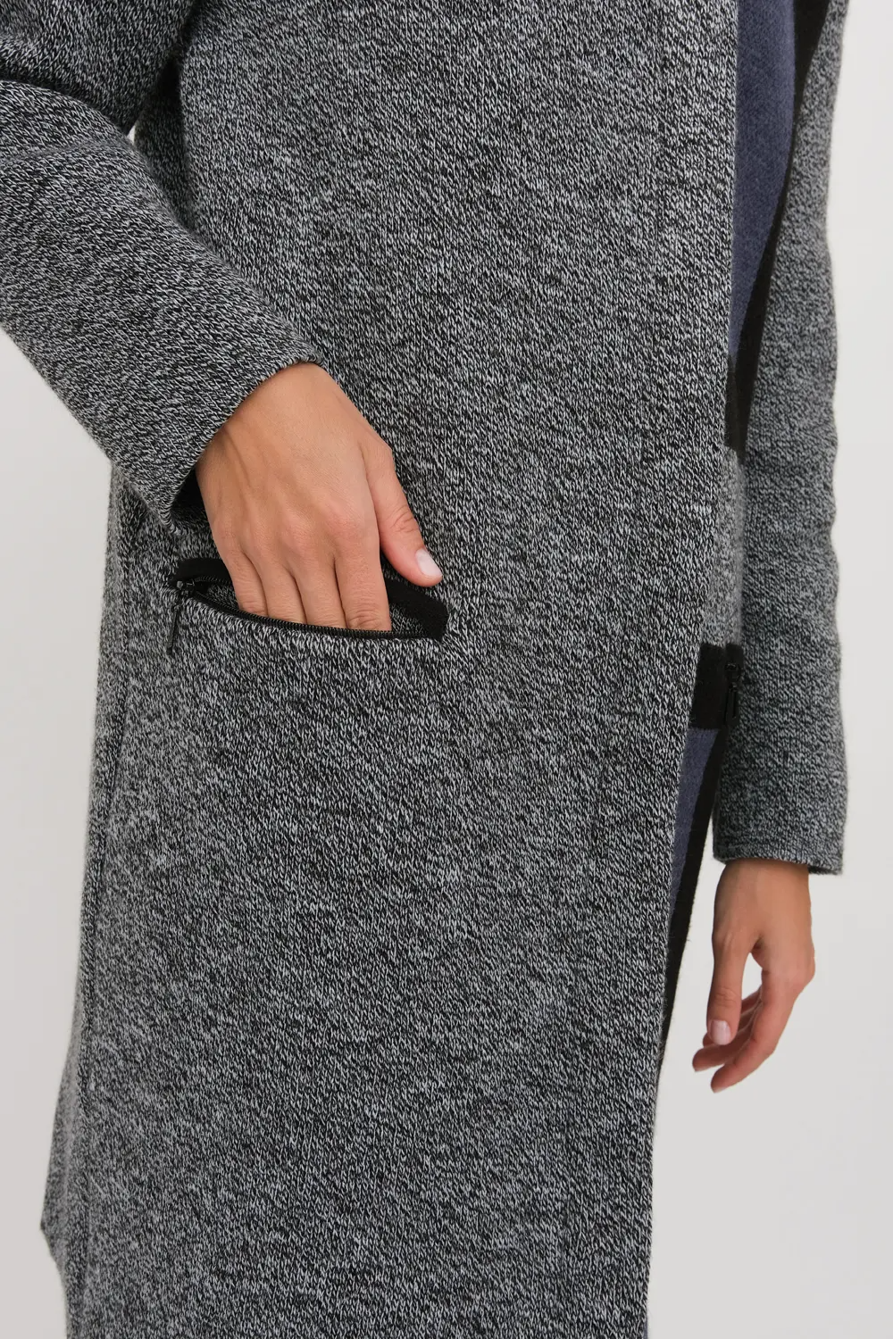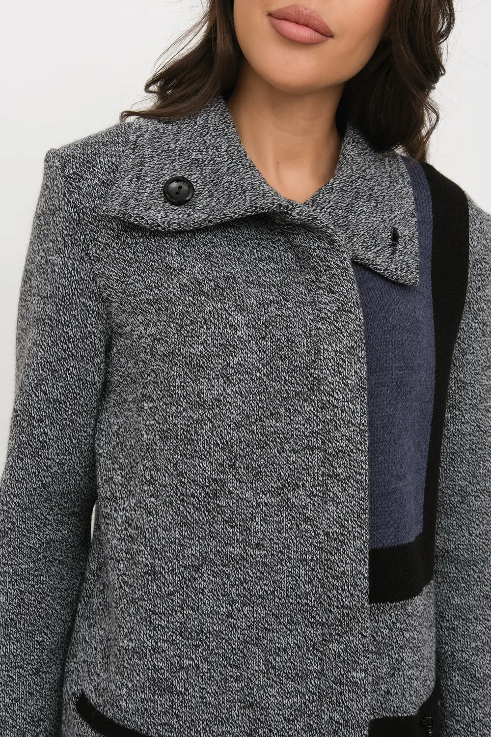 Женский вязаный кардиган полуприлегающего силуэта с асимметричным отворачивающимся воротником-стойкой.  Рукава втачные длинные. Два прорезных кармана на молнии. Кардиган застегивается на молнию. Изделие выполнено жаккардовым переплетением с геометрическими контрастными вставками ч/б-джинс