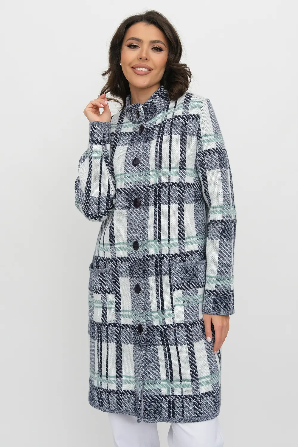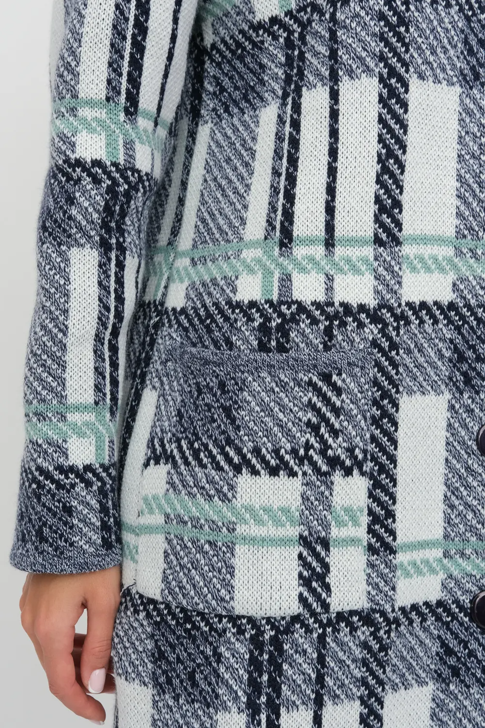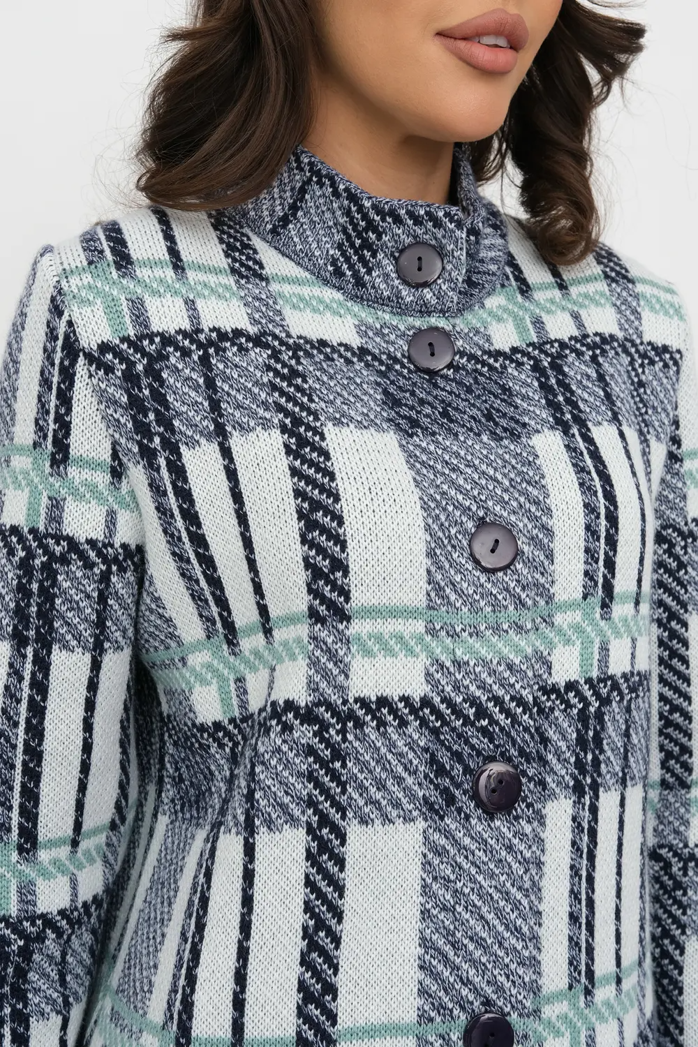 Женский эффектный вязанный кардиган прямого силуэта. Воротник-стойка. Застегивается на пуговицы Рукава втачные длинные. Два накладных кармана. Кардиган выполнен жаккардовым переплетением образующим геометрический рисунок "клетка".  Он согреет вас в прохладный день и подарит ощущение невероятного комфорта. сине-мятный