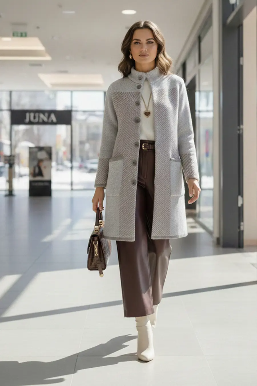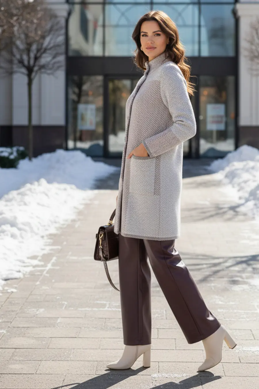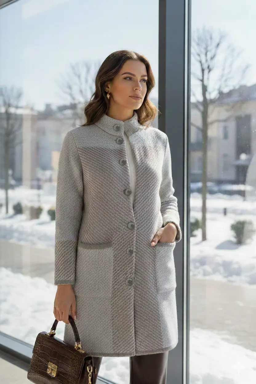 Женский вязаный кардиган полуприлегающего силуэта с воротником-стойкой. Кардиган застегивается на пуговицы. Рукава втачные длинные.  Накладные карманы прямоугольной  формы. Кардиган выполнен жаккардовым переплетением. кофейный микс