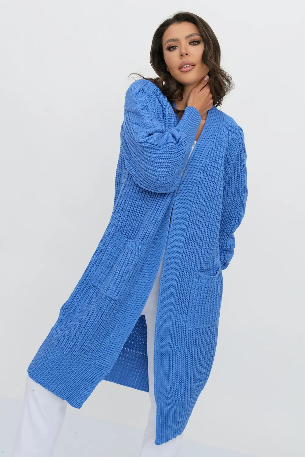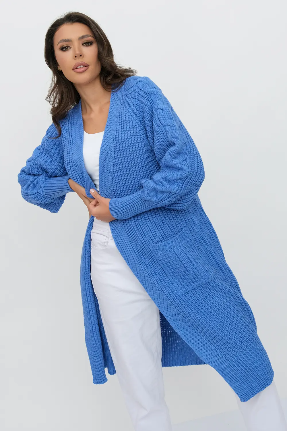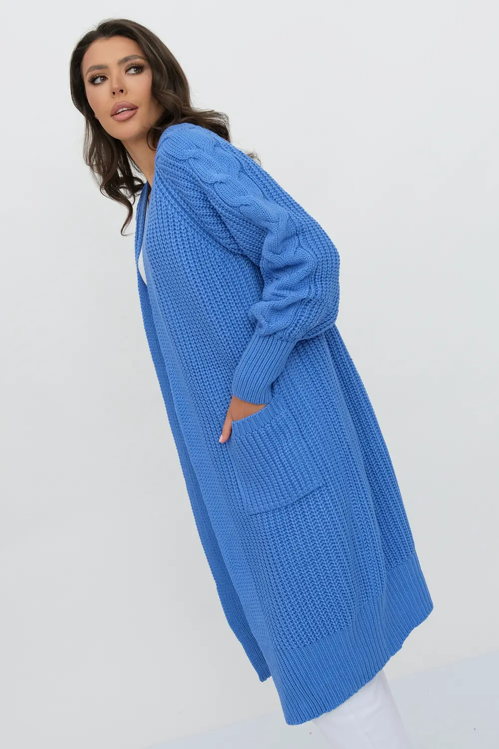Кардиган женский вязаный свободного силуэта. V-образный вырез. Рукав-реглан длинный. По низу рукава и изделия эластичная резинка. Кардиган выполнен объемной вязкой "французская резинка".  Карманы декорированы узором "косы". индиго