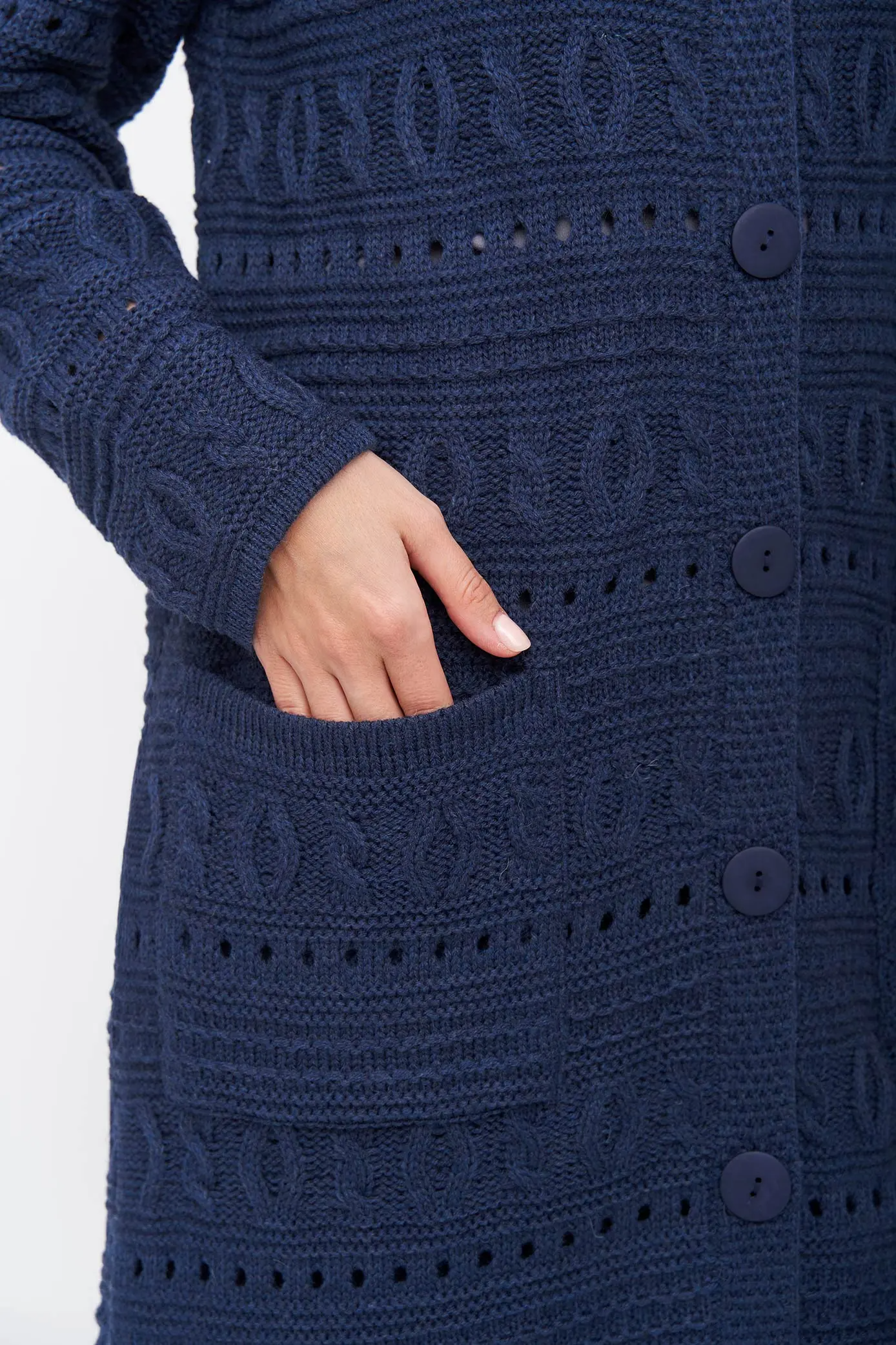 Стильный вязаный женский кардиган прямого силуэта на пуговицах. Воротник - стойка. Рукав втачной полной длины. Накладные карманы.  Оригинальный узор с ажуром. Кардиган с добавлением шерсти согреет в прохладную погоду и придаст оригинальности любому повседневному образу. джинс