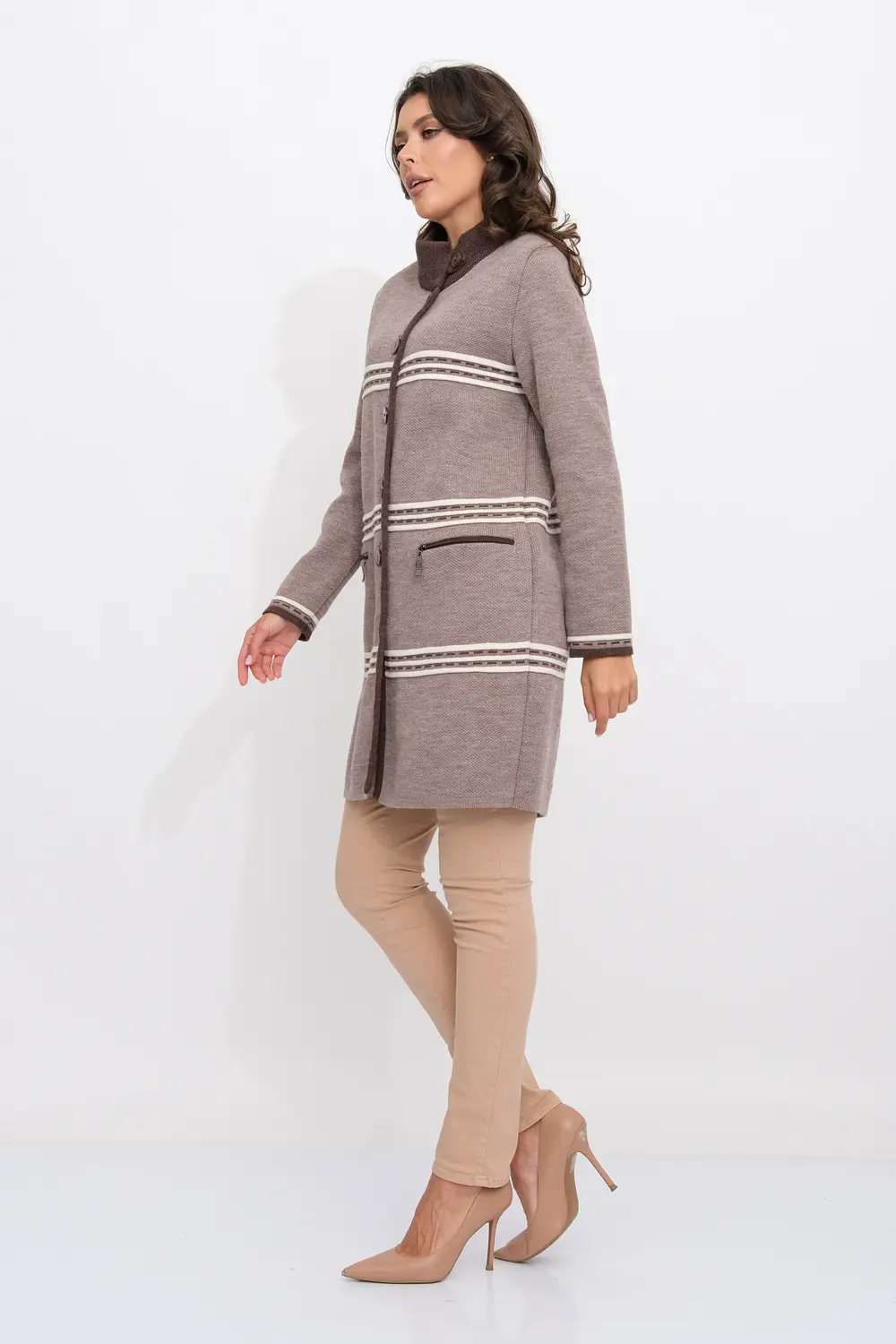 Женский  вязанный кардиган прямого силуэта. Воротник-стойка. Застегивается на пуговицы Рукава втачные длинные. Два прорезных кармана с молнией. Кардиган выполнен жаккардовым переплетением с горизонтальными контрастными полосами.  Он согреет вас в прохладный день и подарит ощущение невероятного комфорта. кофейный микс