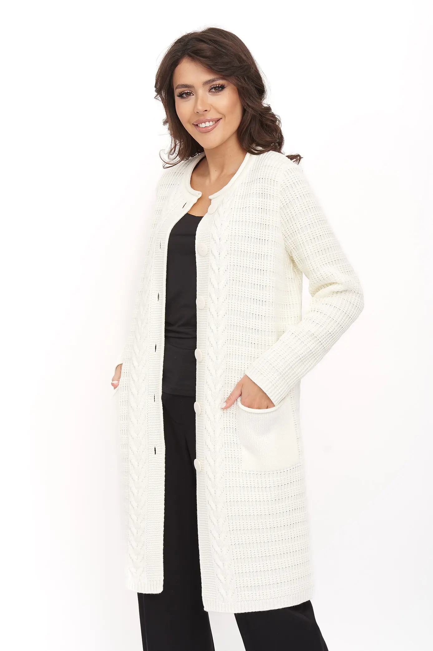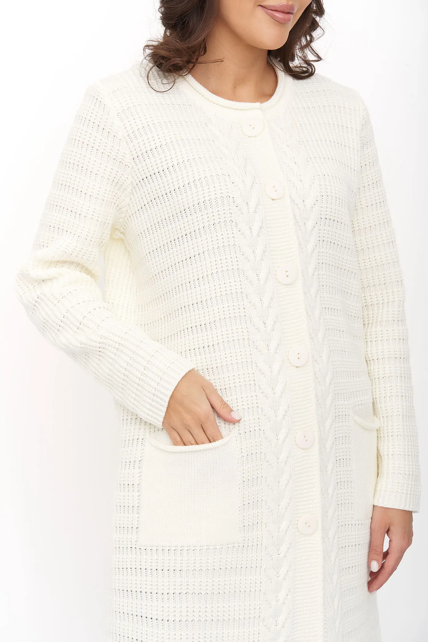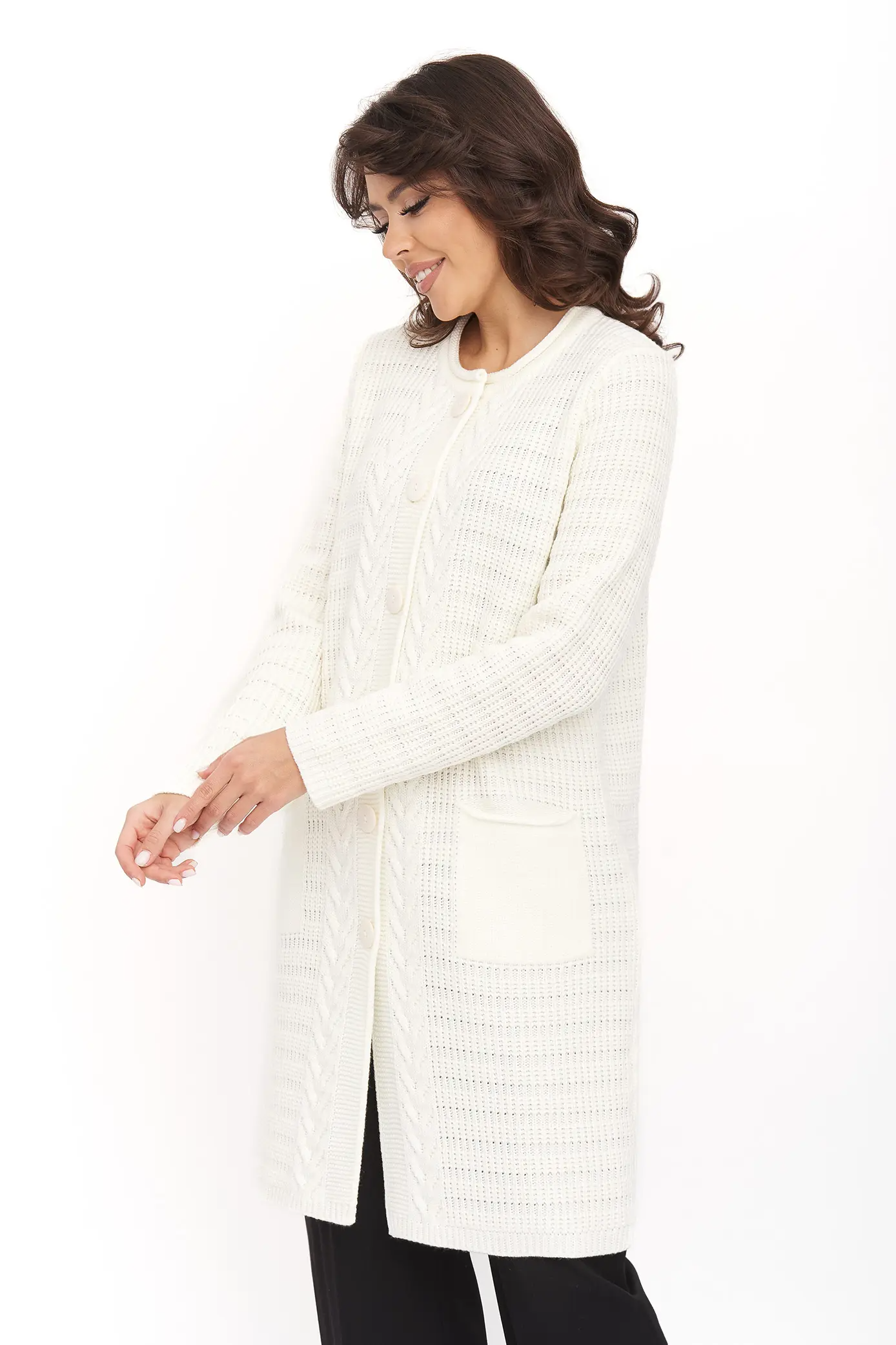 Стильный вязаный женский кардиган прямого силуэта на пуговицах с круглой горловиной. Рукав втачной полной длины. Накладные карманы.  Оригинальный узор с ажуром и косами. Кардиган с добавлением шерсти согреет в прохладную погоду и придаст оригинальности любому повседневному образу. молочный