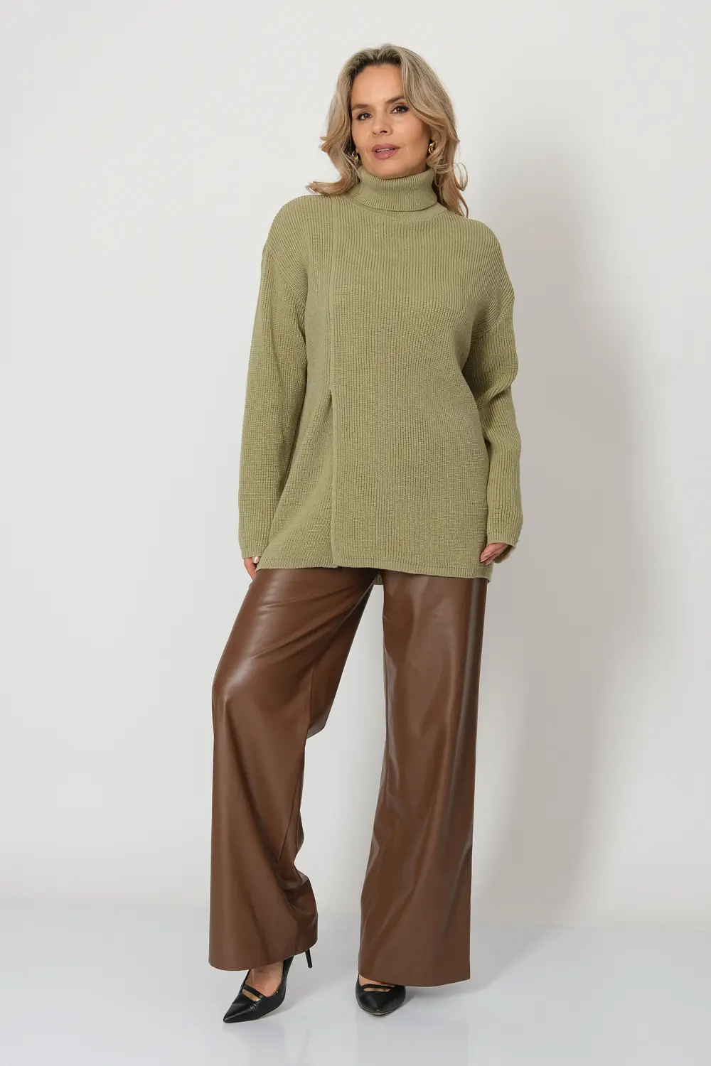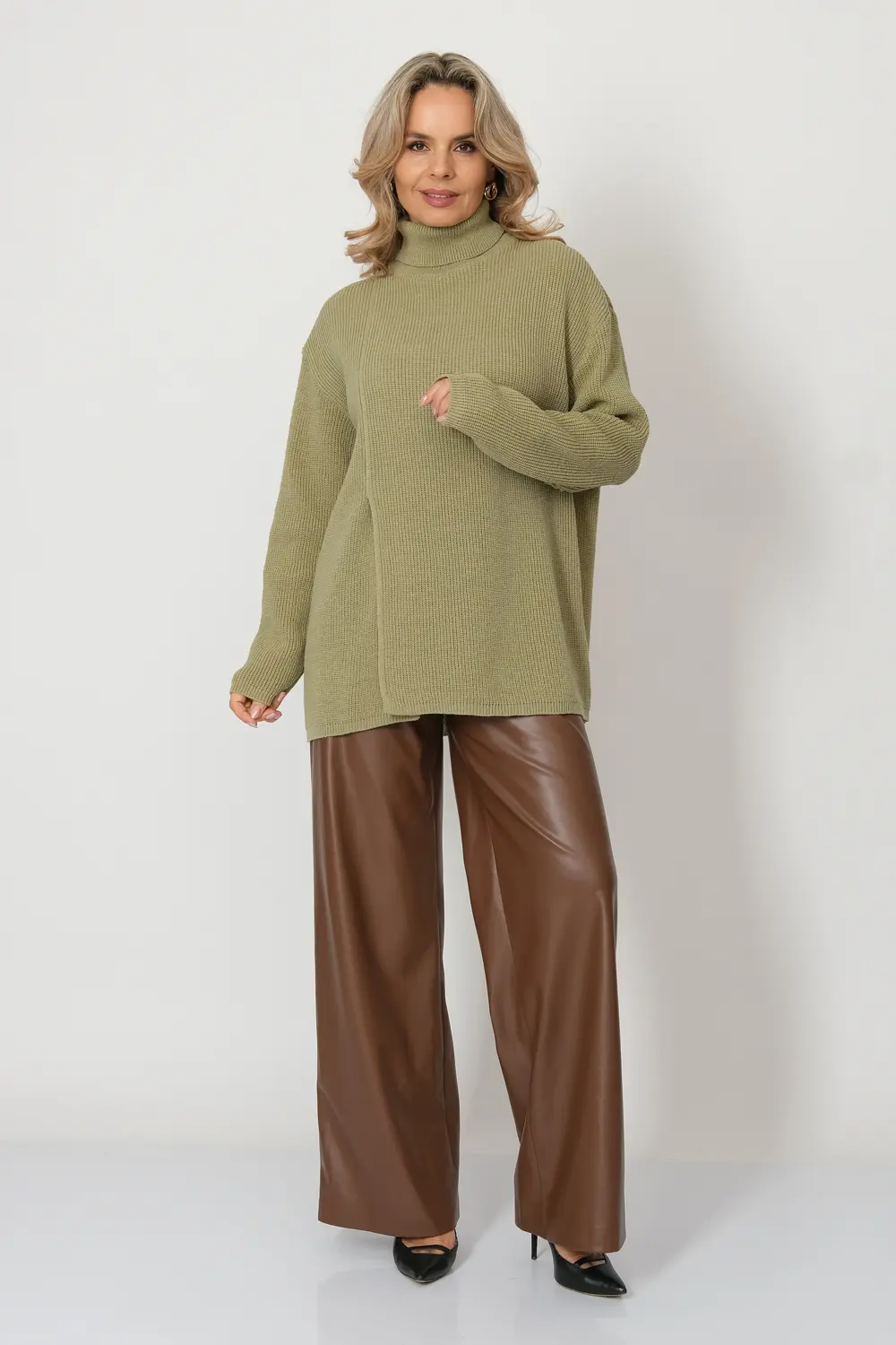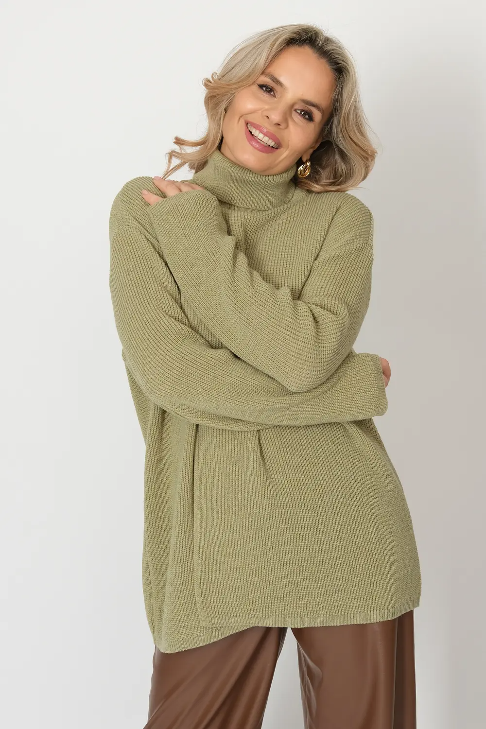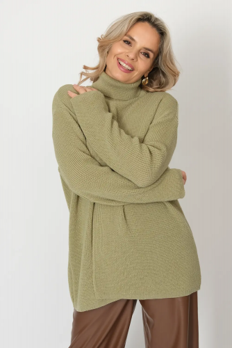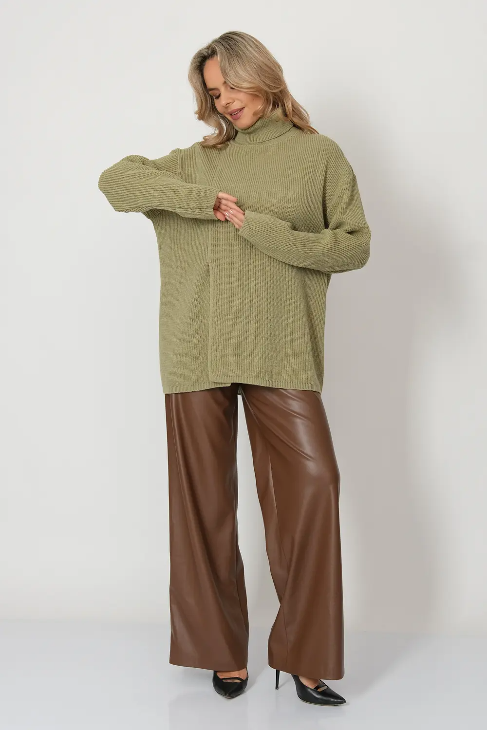 Джемпер оверсайз с воротом-стойкой. Рукава длинные со спущенным плечом. По переднему полотну изделия сбоку стильный глубокий разрез. оливковый