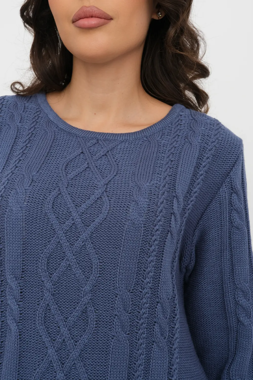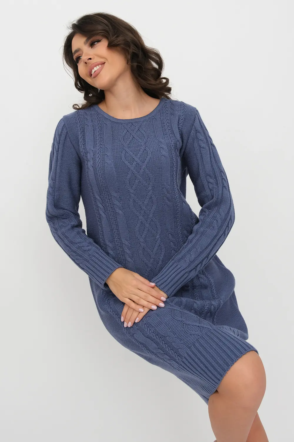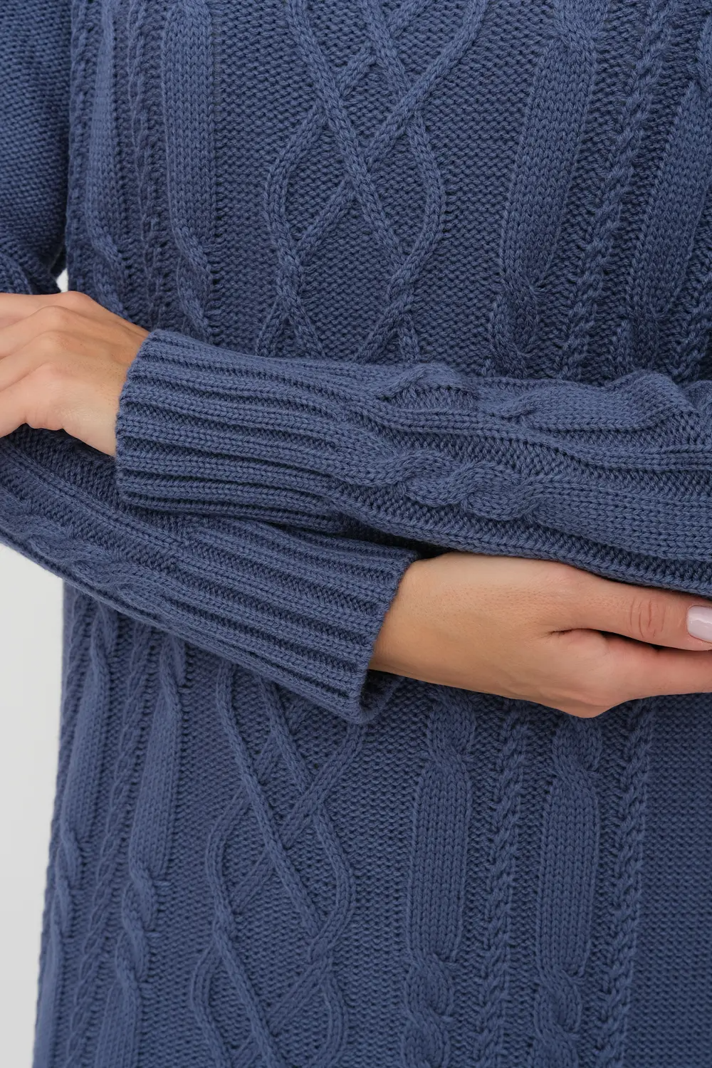 Вязаное платье женское полуприлегающего силуэта . Рукава втачные длинные. Горловина круглая, обработана бейкой.  Платье с фактурным узором  косами станет украшением вашего осеннего гардероба. Женское вязаное платье изготовлено из мягкой и приятной к телу турецкой пряжи с содержанием шерсти.и подходит для использования в зимний период. индиго