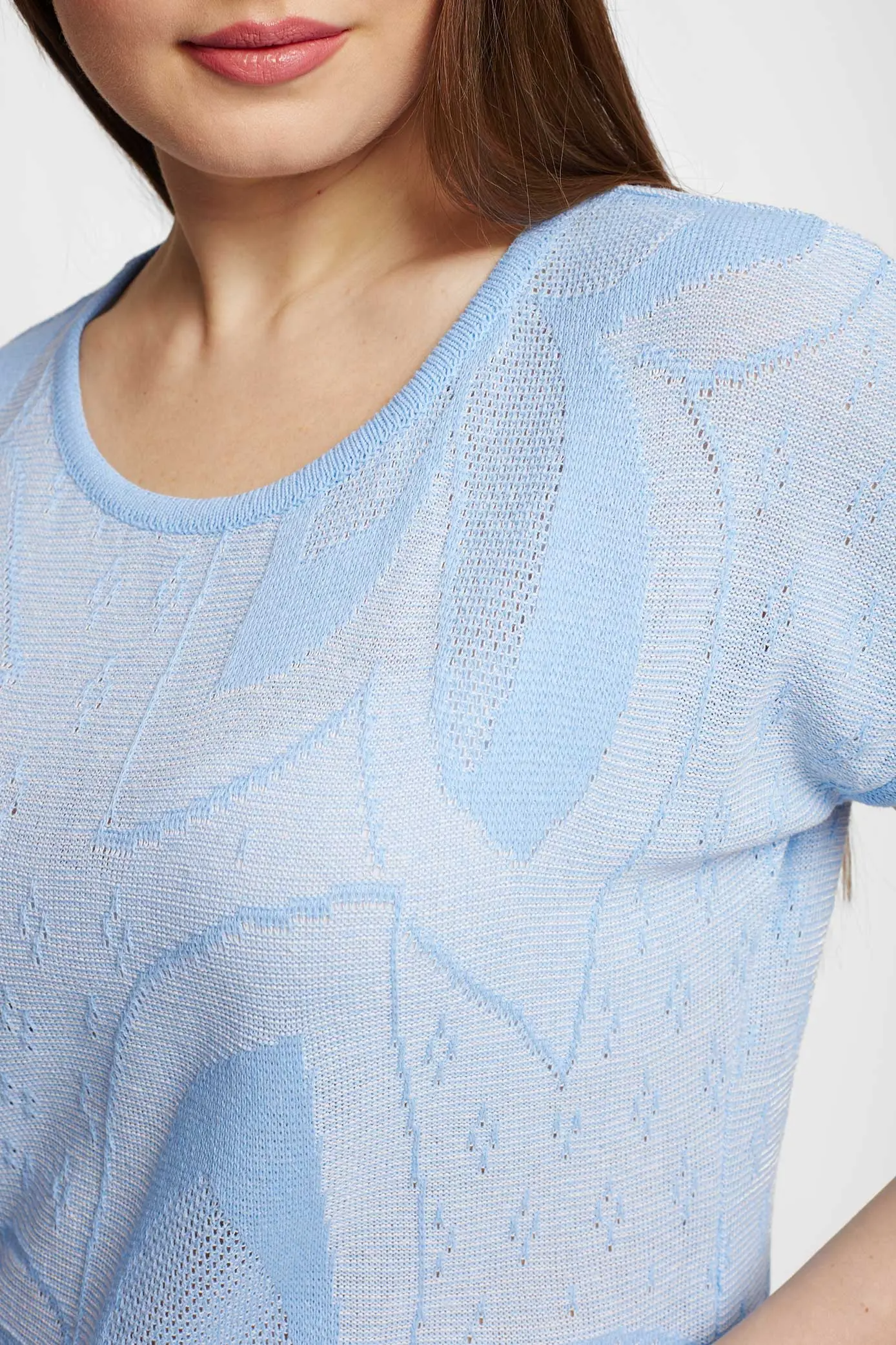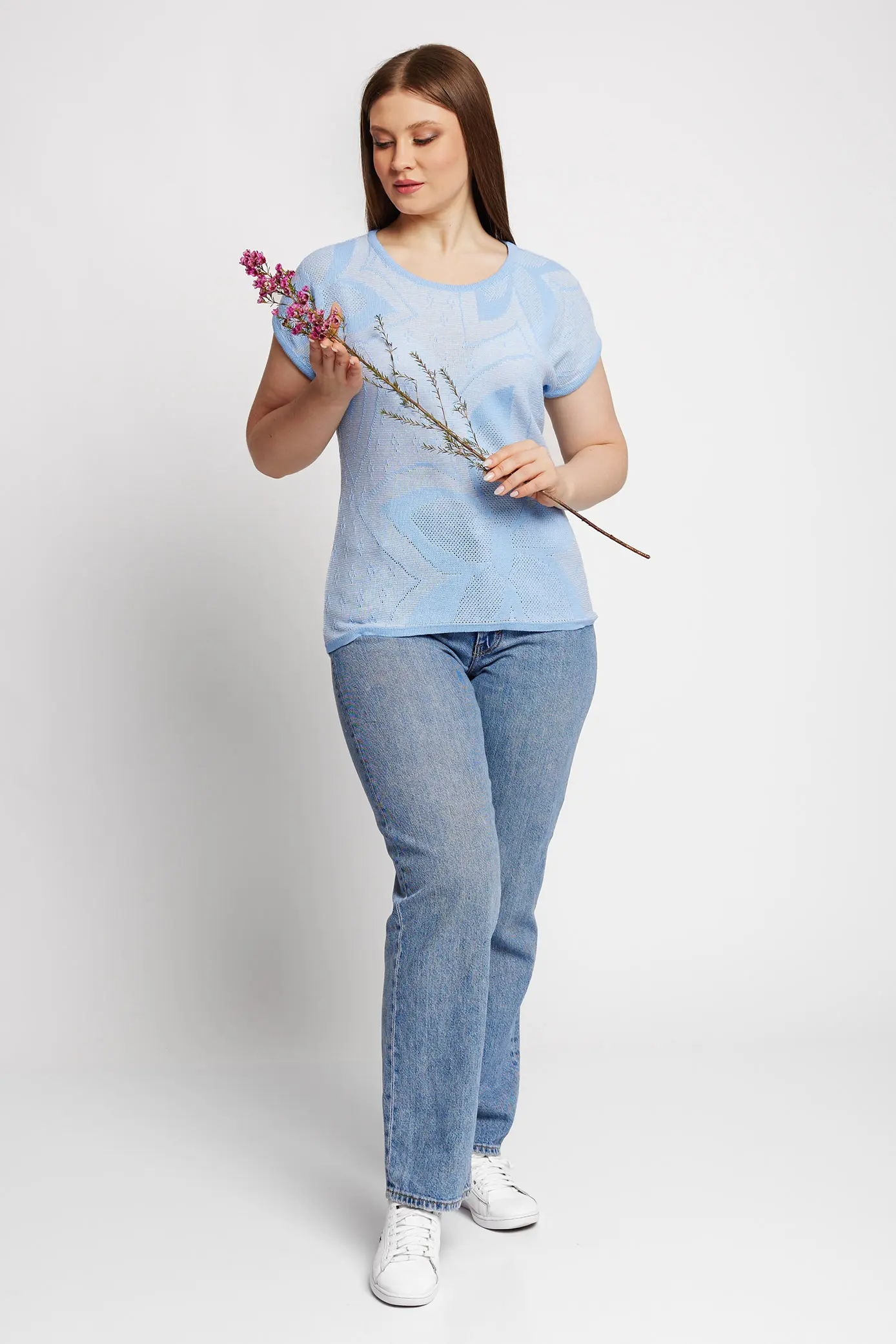Удобный и стильный женский джемпер, с незатейлевым рисунком-цветами. Свободный, не приталенный крой, скрывающий недостатки фигуры. Открытая круглая горловина. голубой1