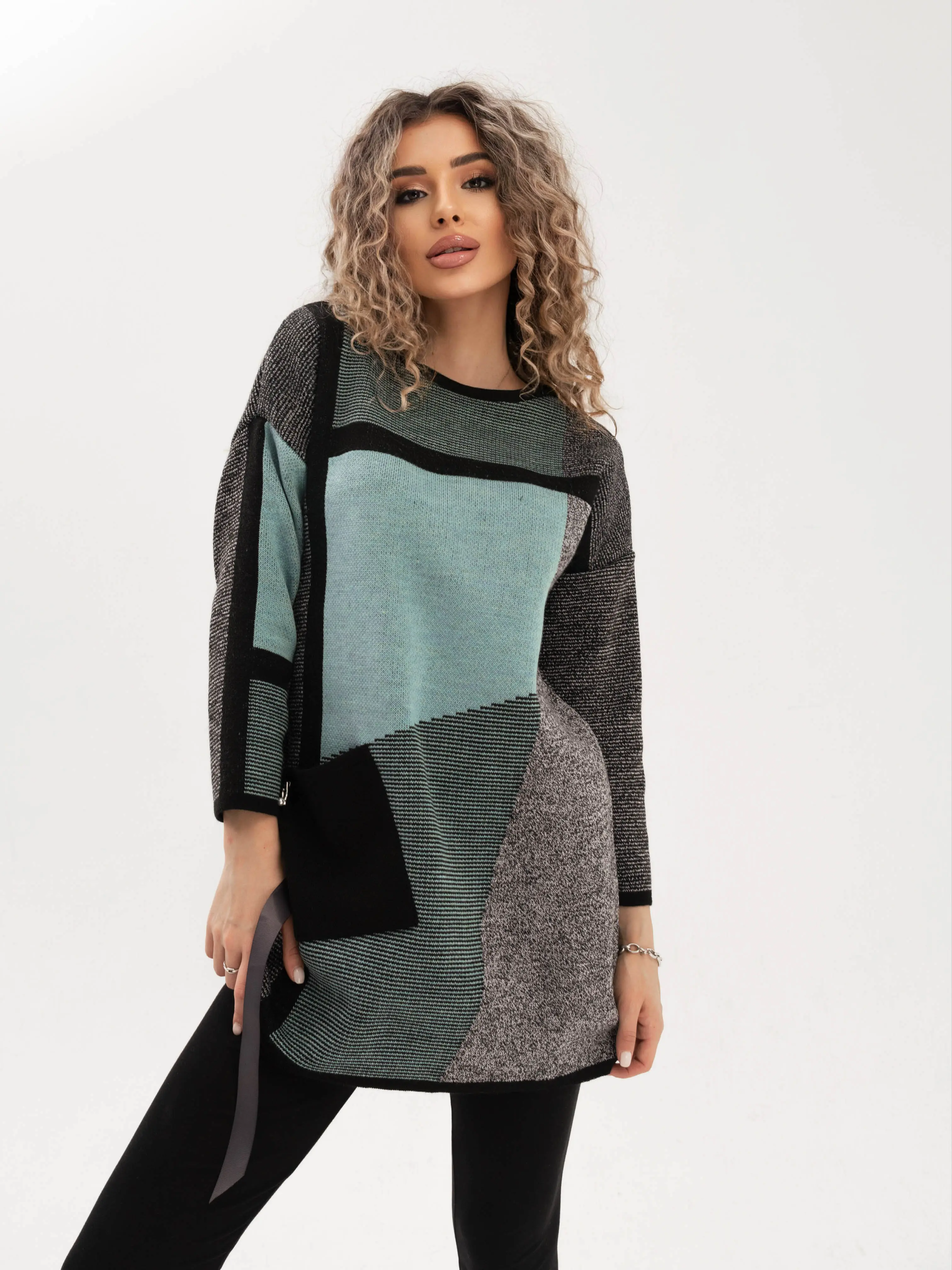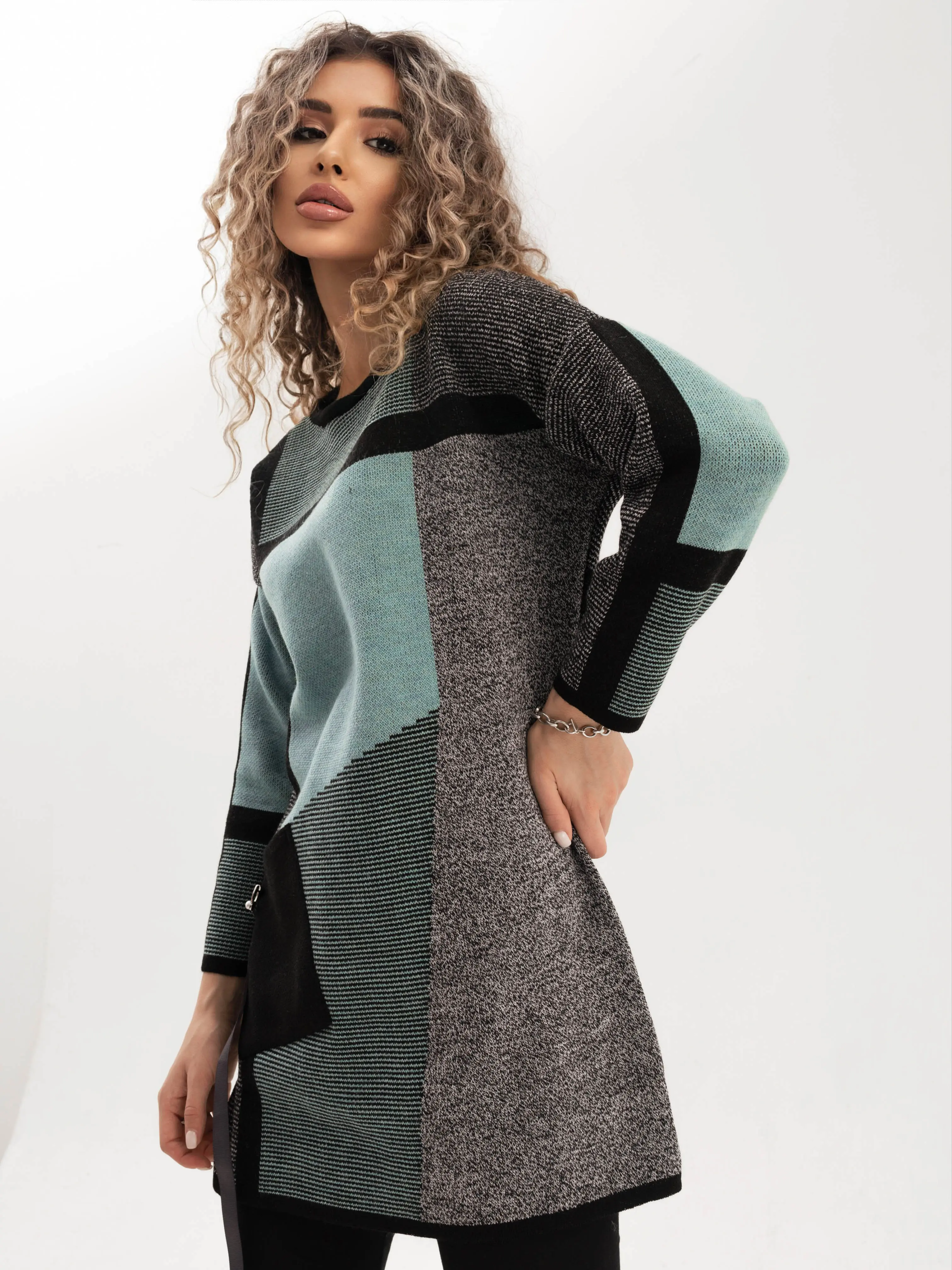 Удлиненный джемпер полуприлегающего силуэта с круглой горловиной, выполнен в оригинальном цветовом  решении. Рукав 3/4. Полочка, спинка и рукава выполнена в жаккардовом переплетении с контрастным геометрическим рисунком. Накладной карман с декоративной тесьмой.