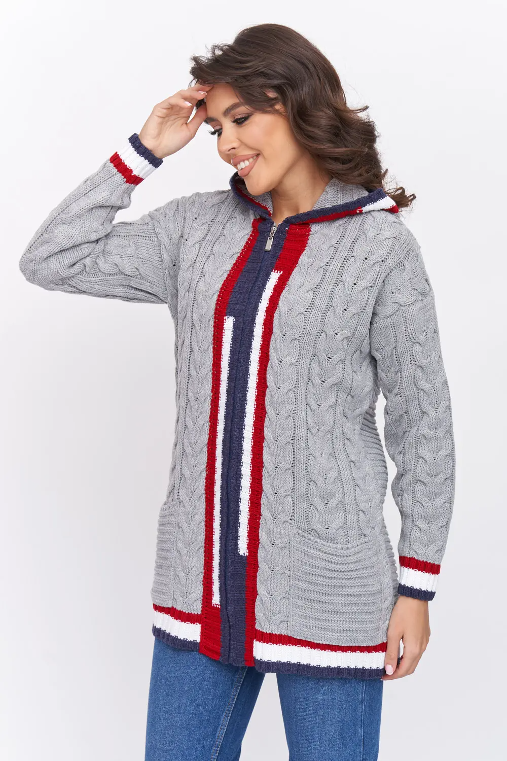 Жакет женский вязаный свободного силуэта, с капюшоном.  Спущеное плечо, рукав длинный. По низу рукава и изделия эластичная резинка. Жакет выполнен вязкой с объемными косами. Жакет декорирован контрастными полосами на капюшоне, манжетах и вдоль полочек. Оптимальный состав - пан-70%, шерсть - 30% - позволяет чувствовать себя комфортно в помещении. Жакет, благодаря свободному крою, подойдет для любого типа фигуры. серый