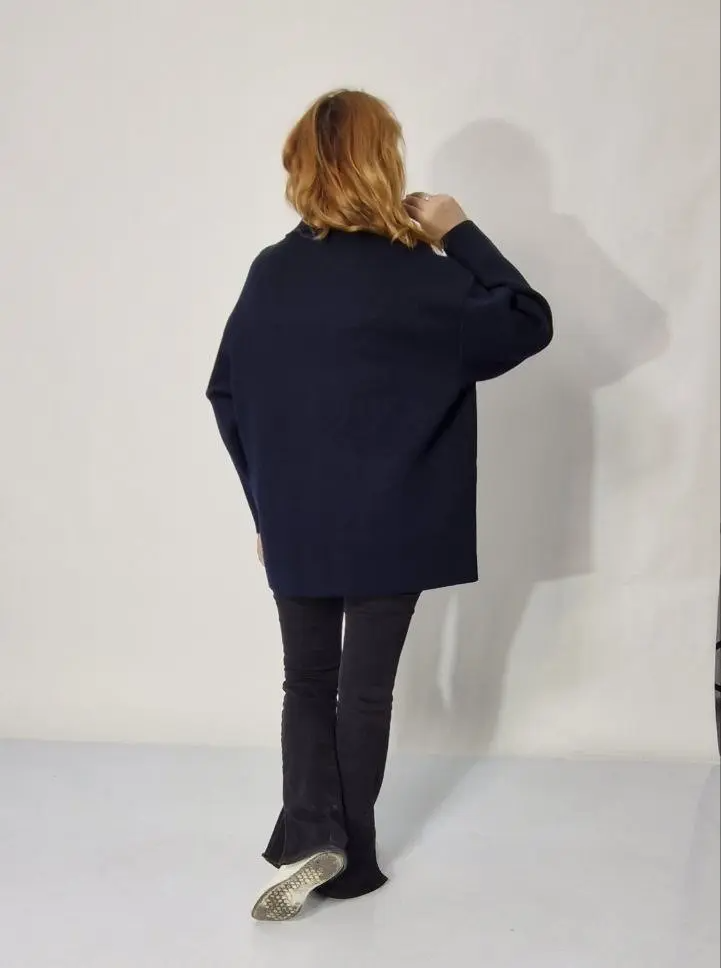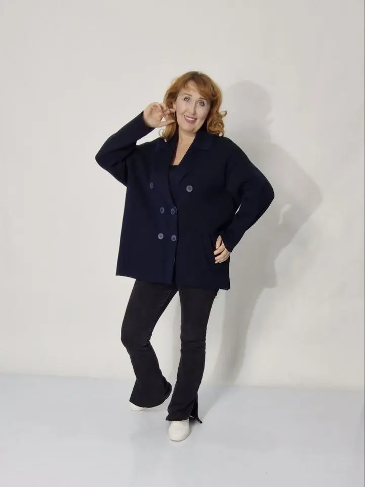 Двубортный женский жакет с отложным английским воротником прямого кроя овесайз. Спущеное плечо, карманы прорезные в боковых швах. Контрастная отделка темно-синий