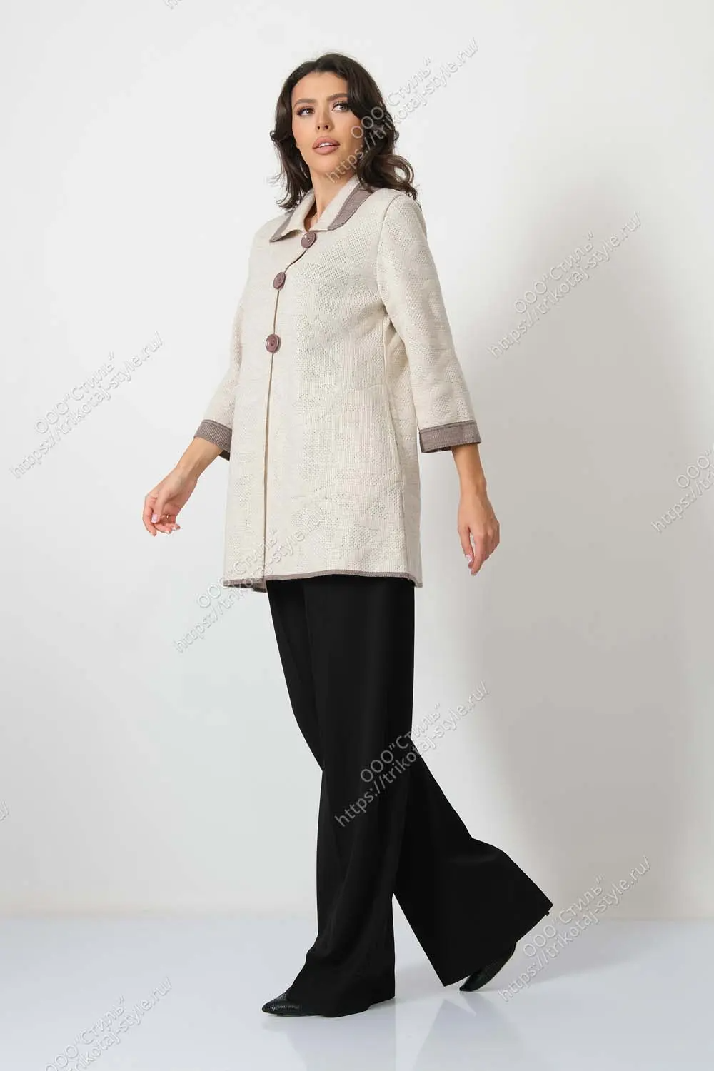 Жакет с отложным воротником, застегивающийся на три крупные пуговицы. Рукав втачной длиной 7/8. Карманы функциональные прорезные в боковых швах. молочный