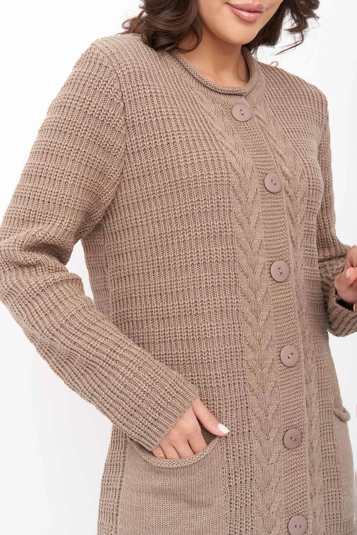 Стильный вязаный женский кардиган прямого силуэта на пуговицах с круглой горловиной. Рукав втачной полной длины. Накладные карманы.  Оригинальный узор с ажуром и косами. Кардиган с добавлением шерсти согреет в прохладную погоду и придаст оригинальности любому повседневному образу. кофе