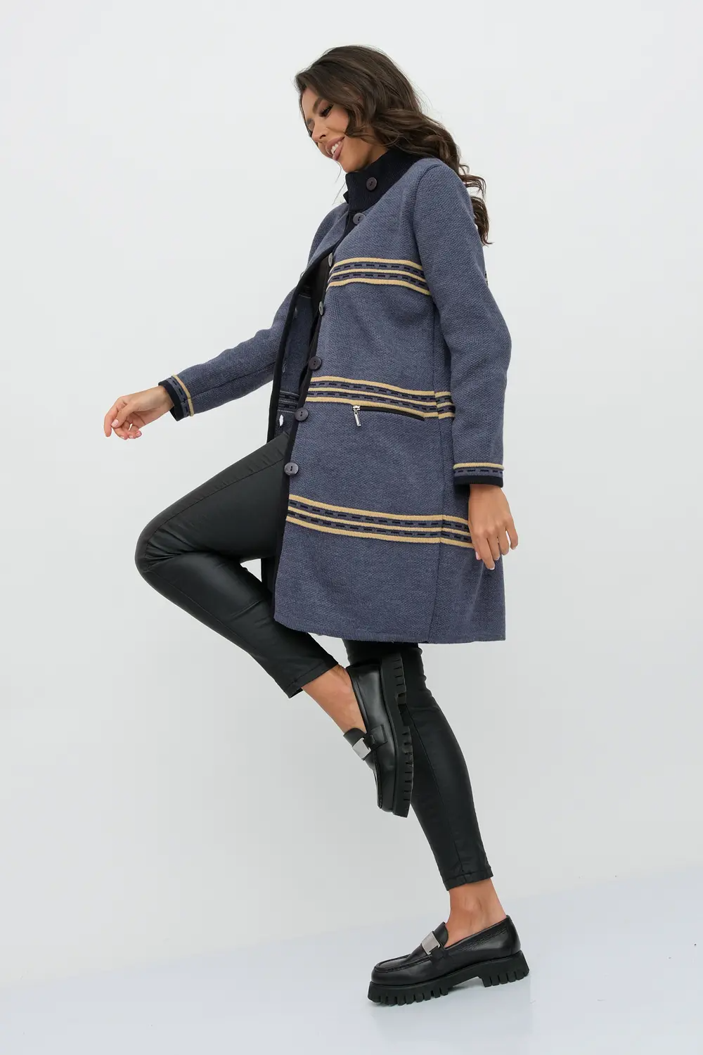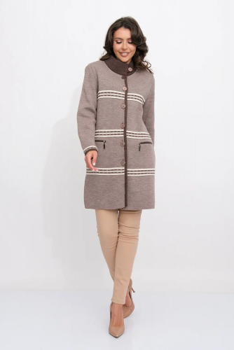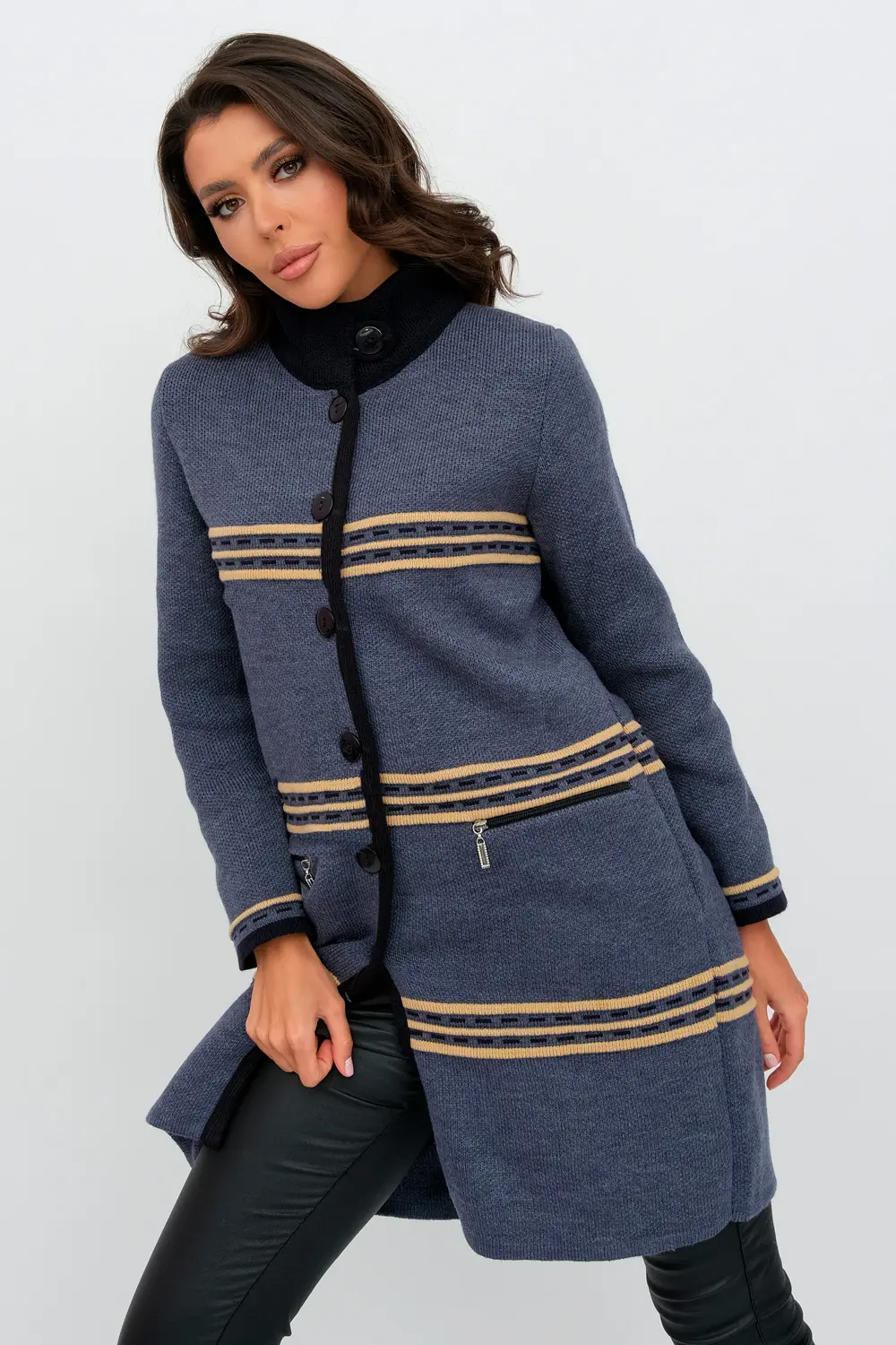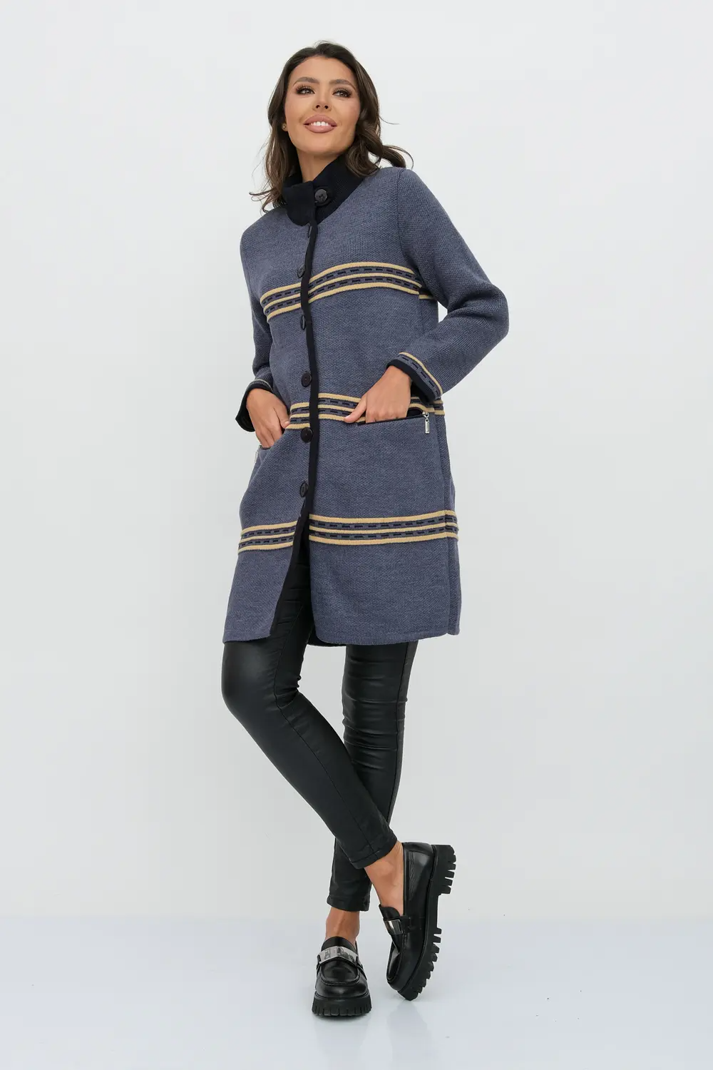Женский  вязанный кардиган прямого силуэта. Воротник-стойка. Застегивается на пуговицы Рукава втачные длинные. Два прорезных кармана с молнией. Кардиган выполнен жаккардовым переплетением с горизонтальными контрастными полосами.  Он согреет вас в прохладный день и подарит ощущение невероятного комфорта. джинсовый микс