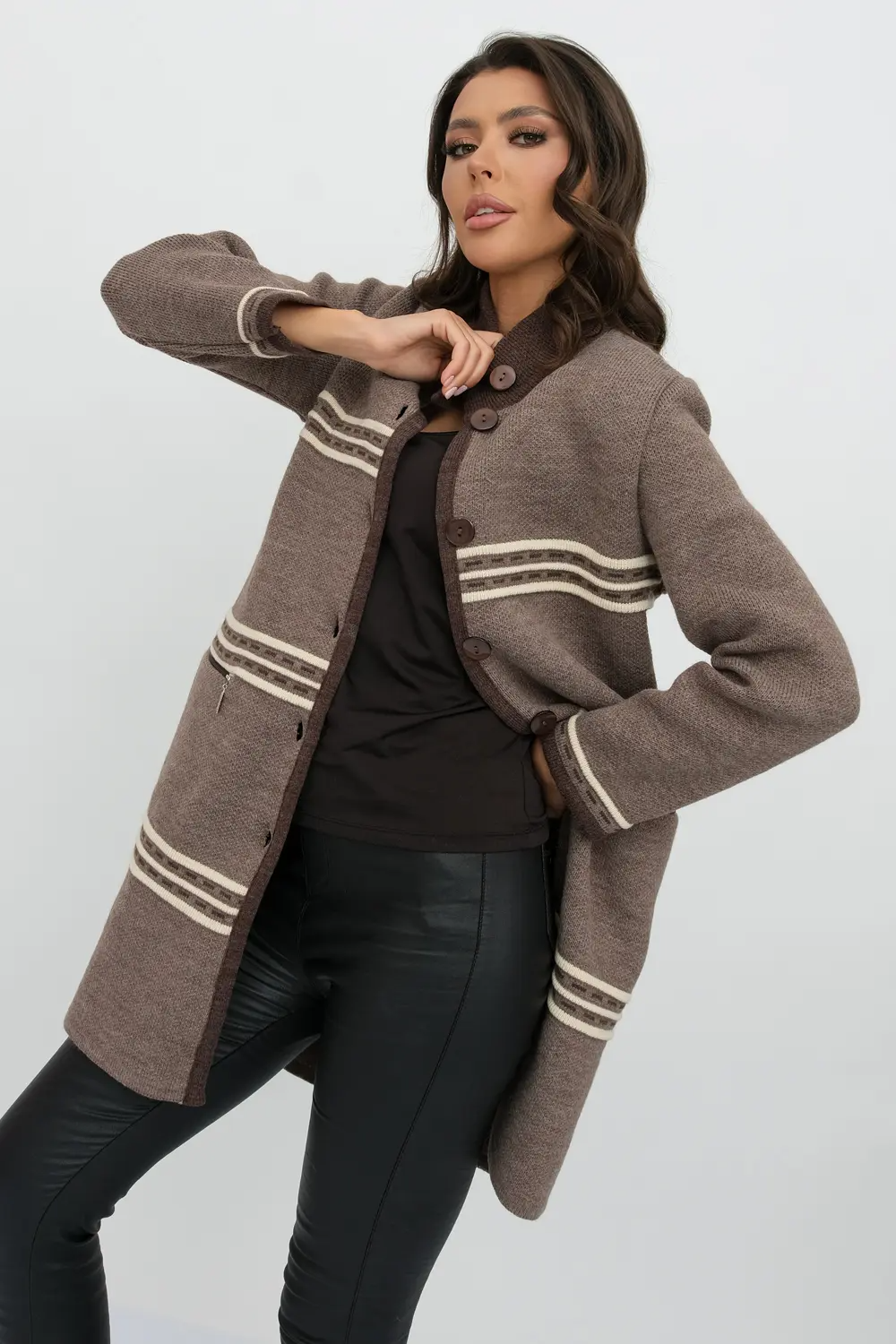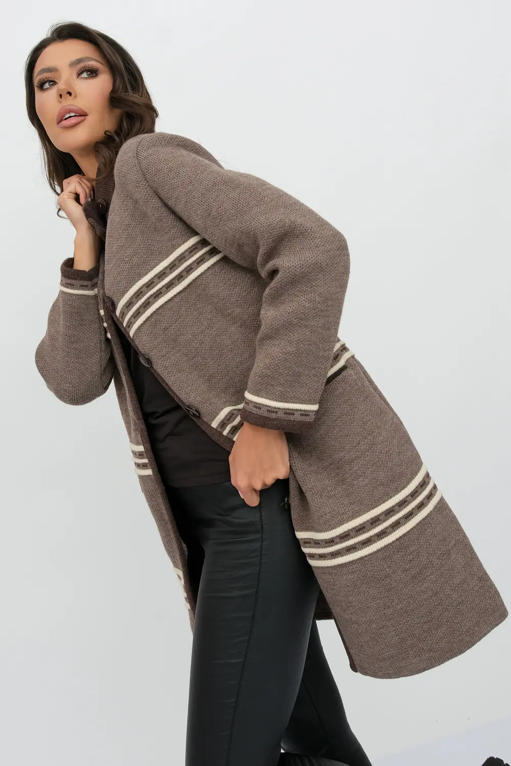 Женский  вязанный кардиган прямого силуэта. Воротник-стойка. Застегивается на пуговицы Рукава втачные длинные. Два прорезных кармана с молнией. Кардиган выполнен жаккардовым переплетением с горизонтальными контрастными полосами.  Он согреет вас в прохладный день и подарит ощущение невероятного комфорта. темно-кофейный