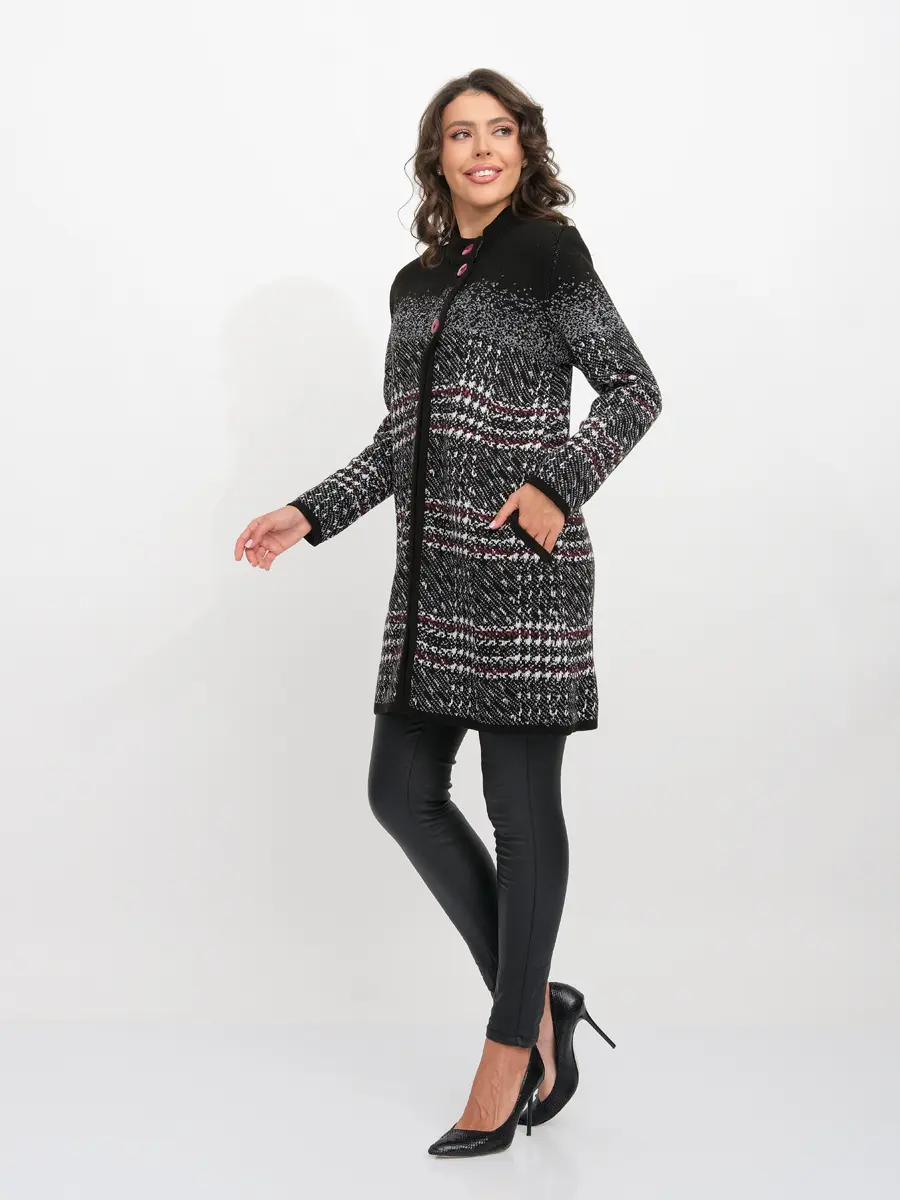 Женский эффектный вязанный кардиган с ассиметричным бортом. Воротник-стойка. Кардиган на молнии по всей длине, с декоративными застежками- пуговицами по верху изделия. Рукава втачные длинные. Два прорезных кармана. Жаккардовое переплетение образует геометрический рисунок.  Кардиган согреет вас в прохладный день и подарит ощущение невероятного комфорта. черный-фуксия
