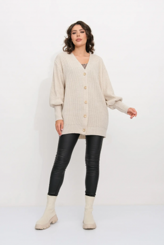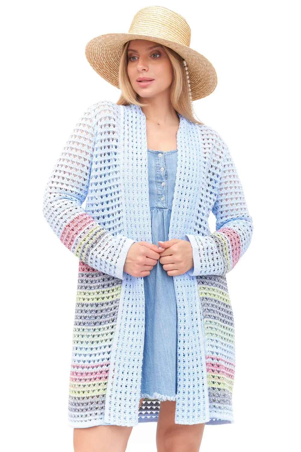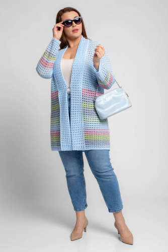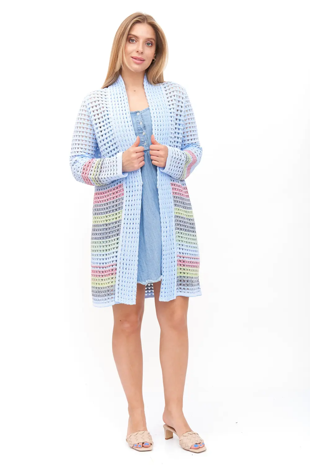 Кардиган свободного силуэта с длинным втачным рукавом.  По переду проходят отворачивающиеся борта. Небольшая застежка по переду. Кардиган выполнен переплетением "сетка" с цветными переходами. голубой микс