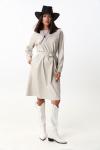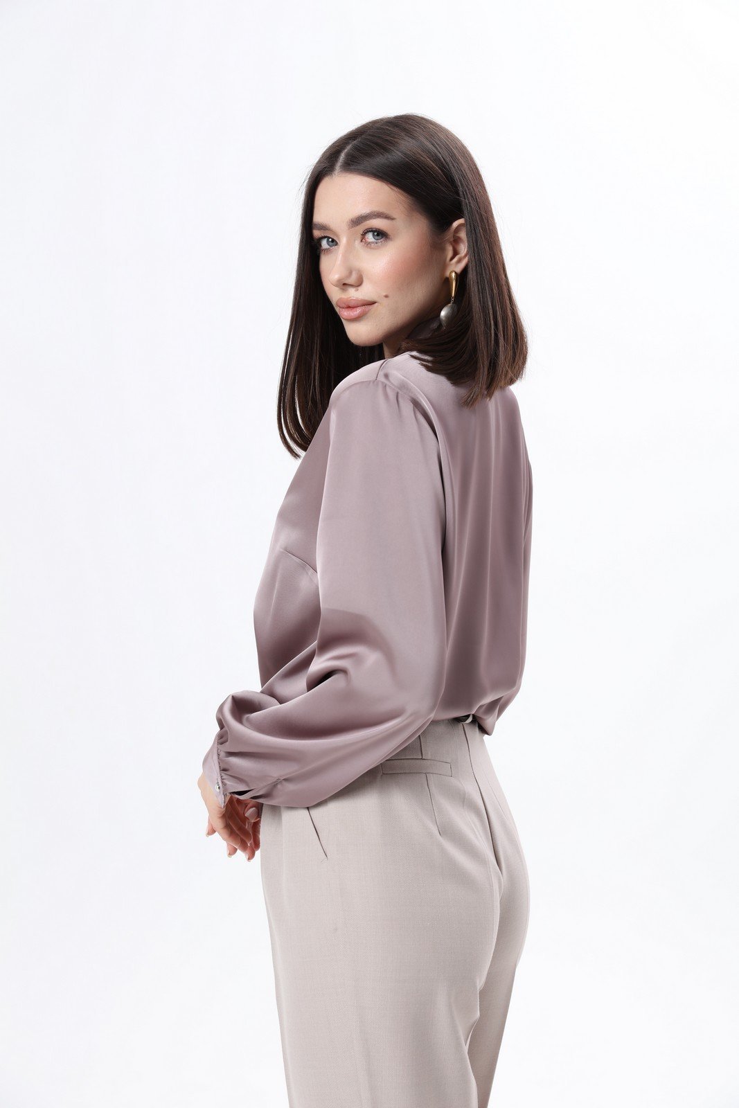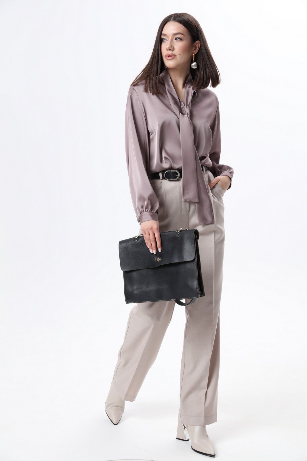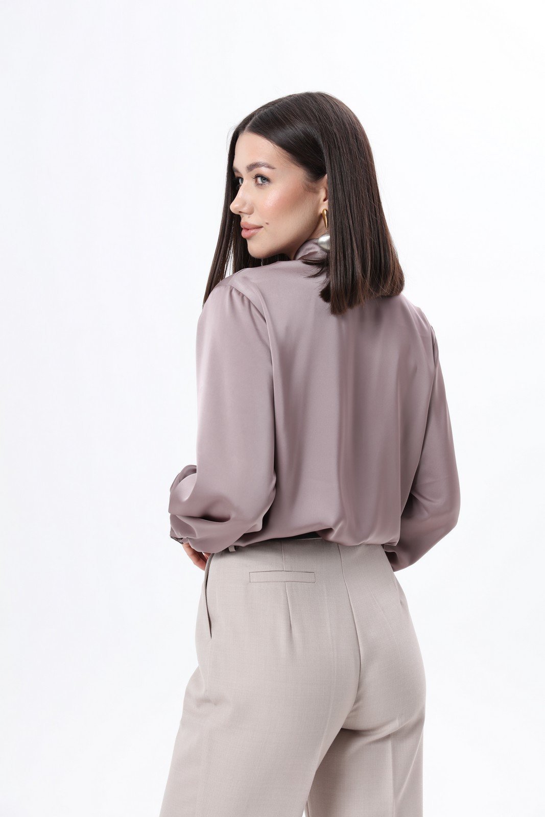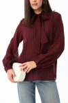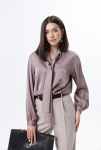 Элегантная блуза из плотной струящейся ткани с атласным эффектом объёмного кроя, с декоративными завязками на горловине. По переду блузы прошиты нагрудные вытачки. Манжеты с застёжкой на пуговицу. Рост фотомодели 175 см.