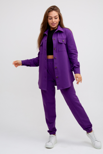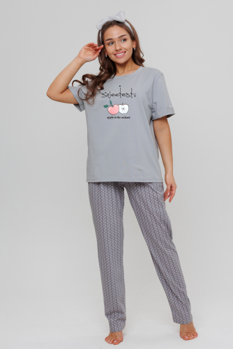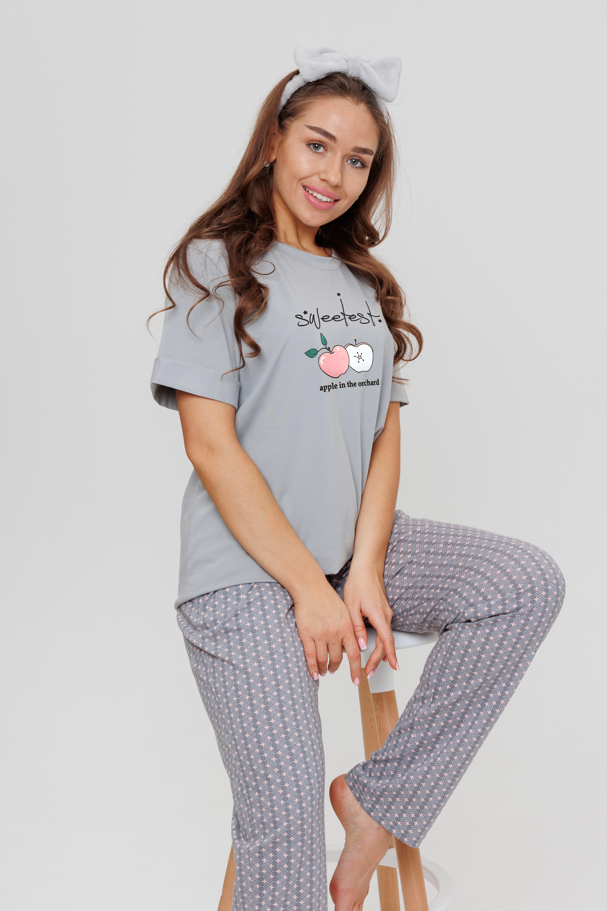 Домашний костюм состоит из футболки и брюк. На передней полочке футболки дизайнерский принт. Брюки на мягкой эластичной резинке, в боковых швах располагаются карманы.