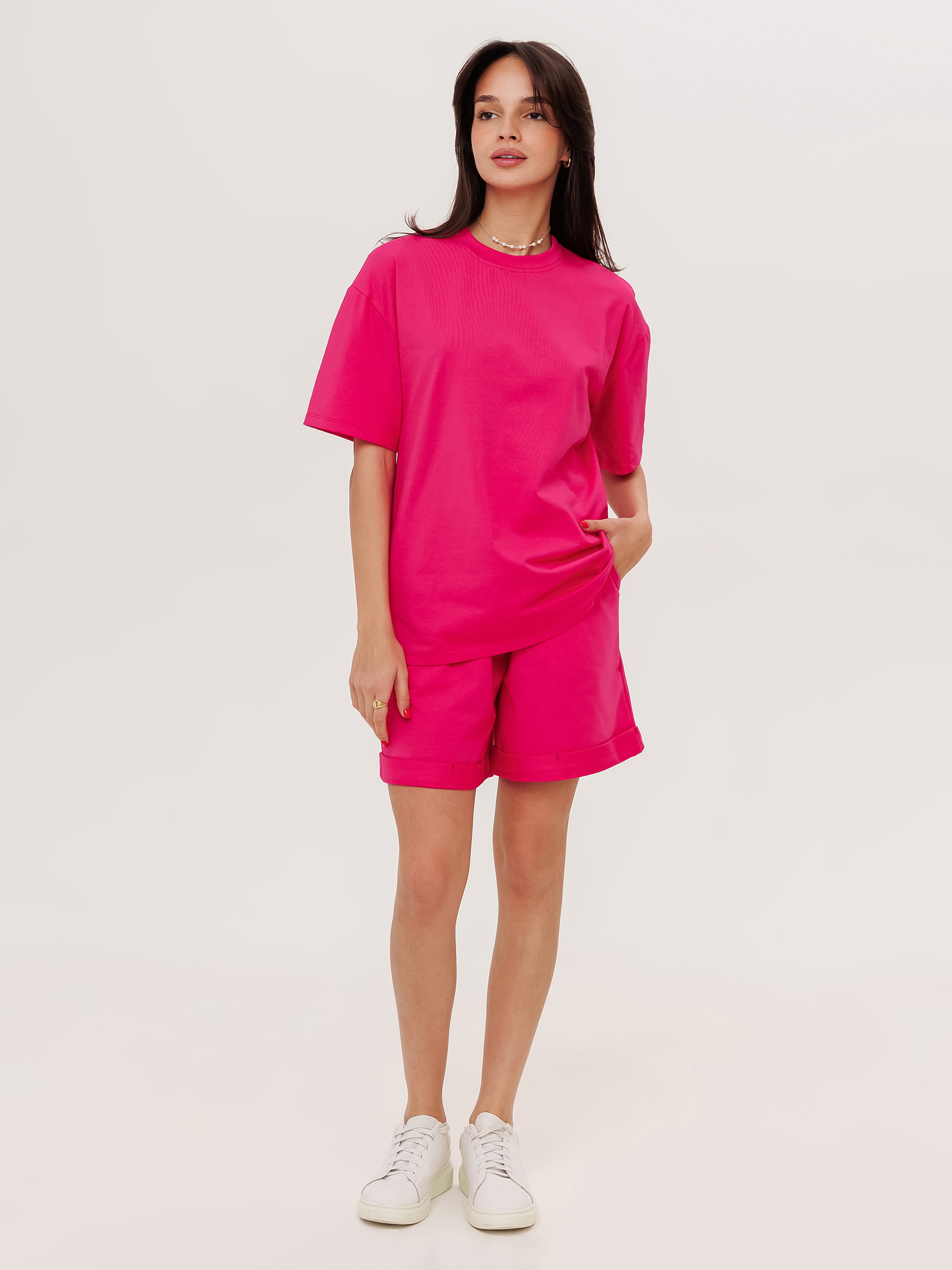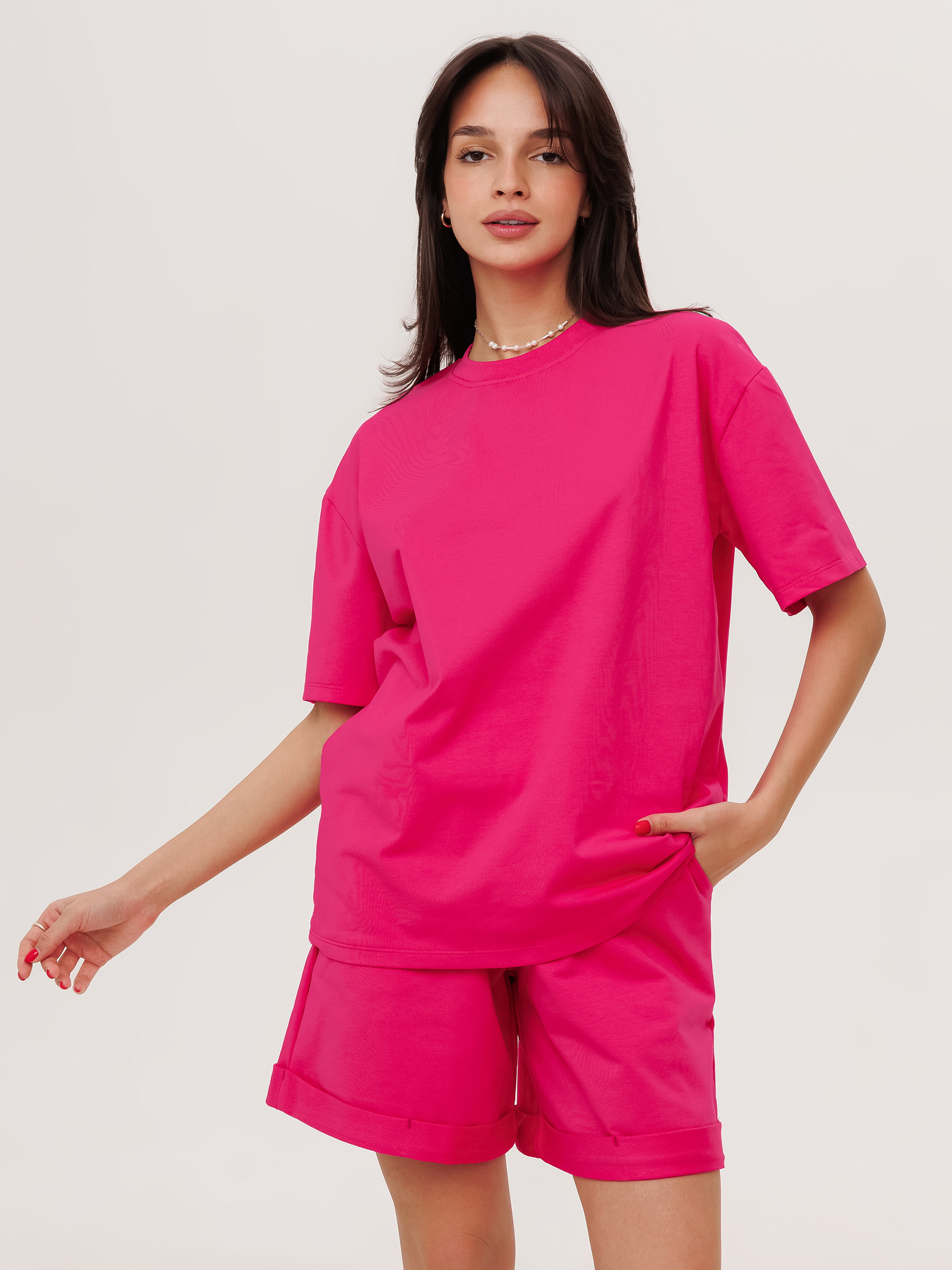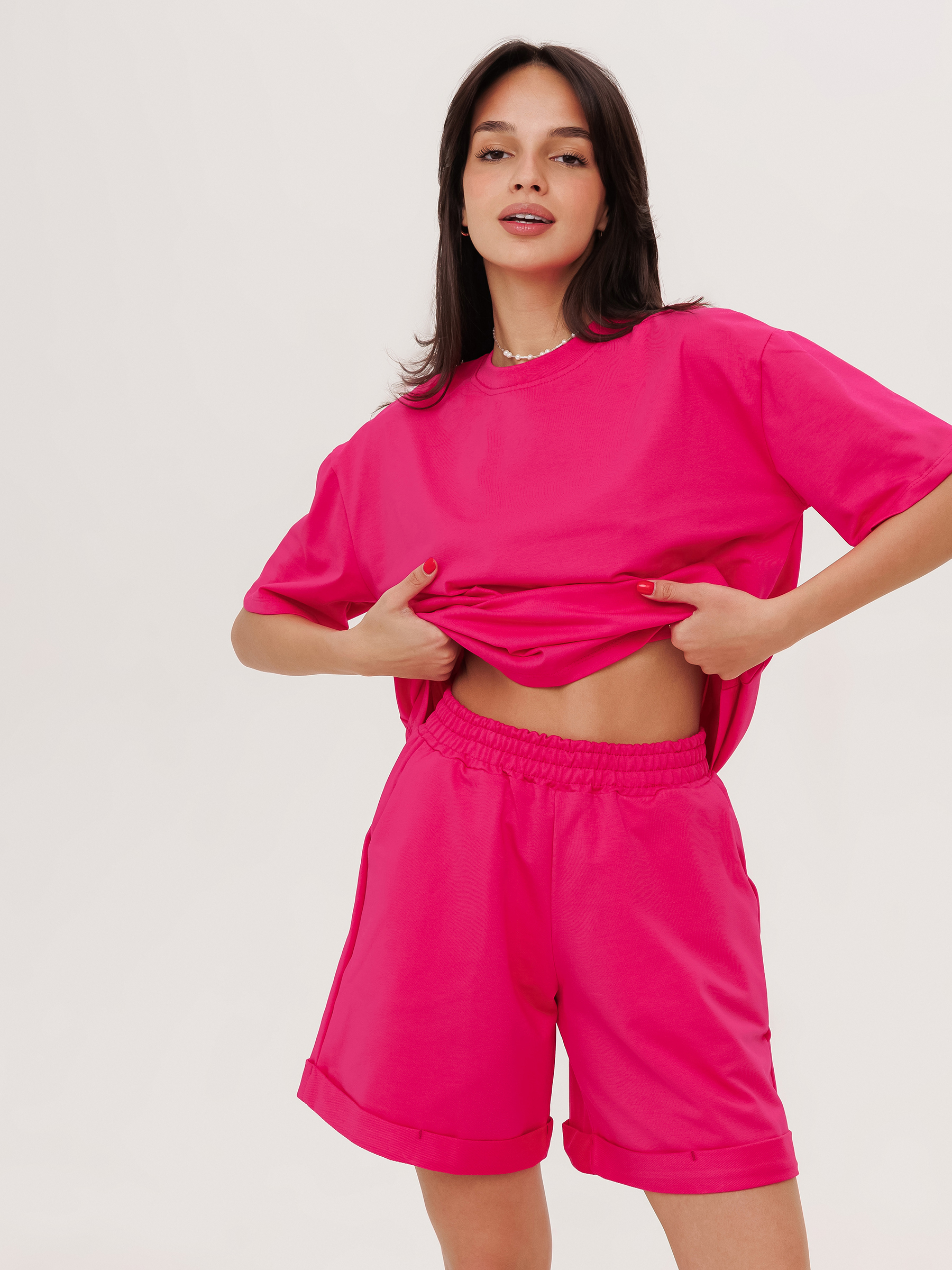 Стильный молодежный костюм из разных трикотажных полотен состоит из футболки и шорт