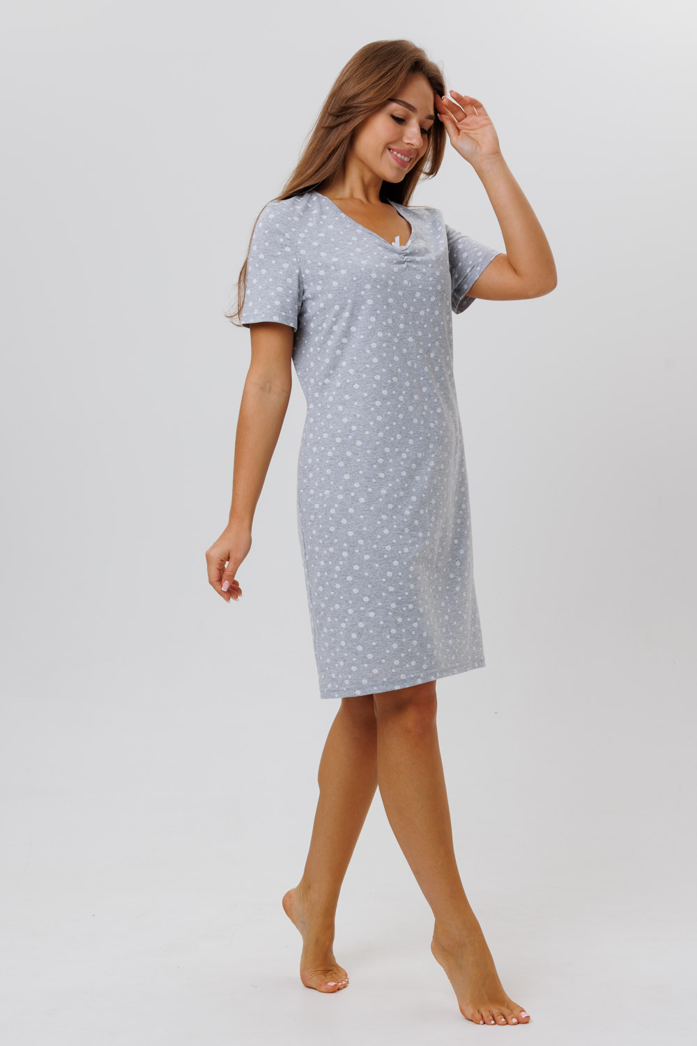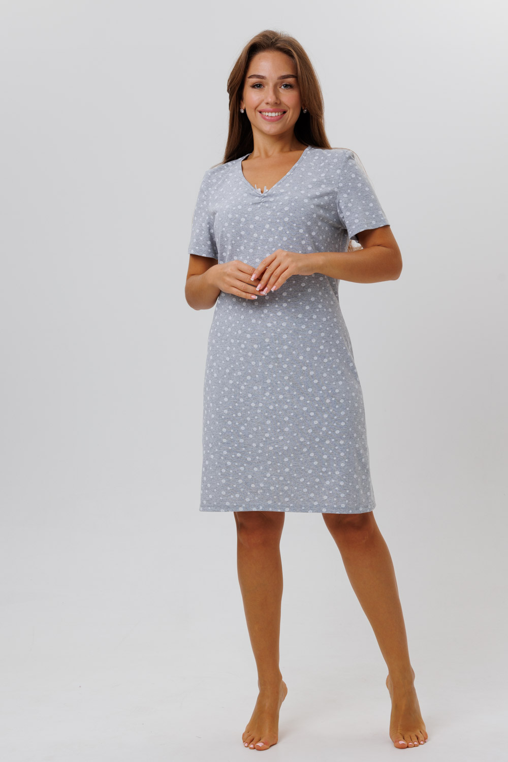 Туника сшита из трикотажного полотна - мягкой хлопковой ткани. Домашнее платье прямого кроя, без карманов, с коротким рукавом, с V-образным вырезом горловины. Длина - до колен. Модель свободного облегания, полуприлегающего силуэта.