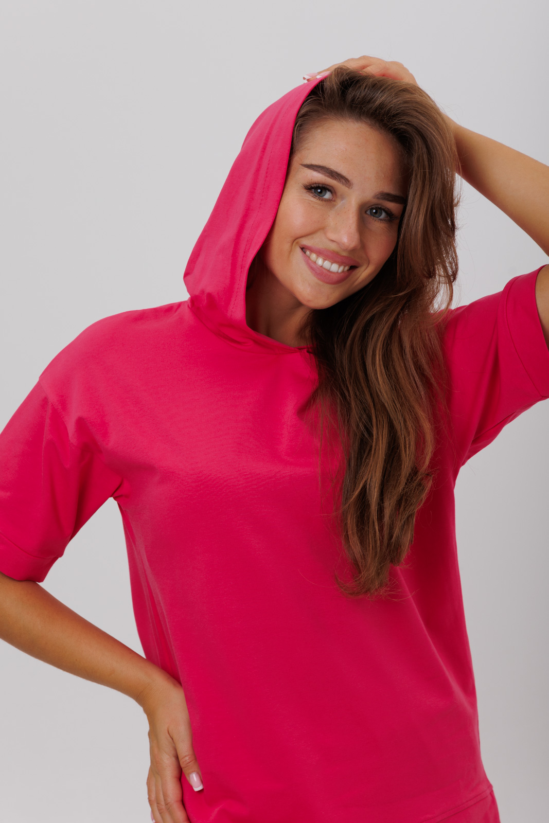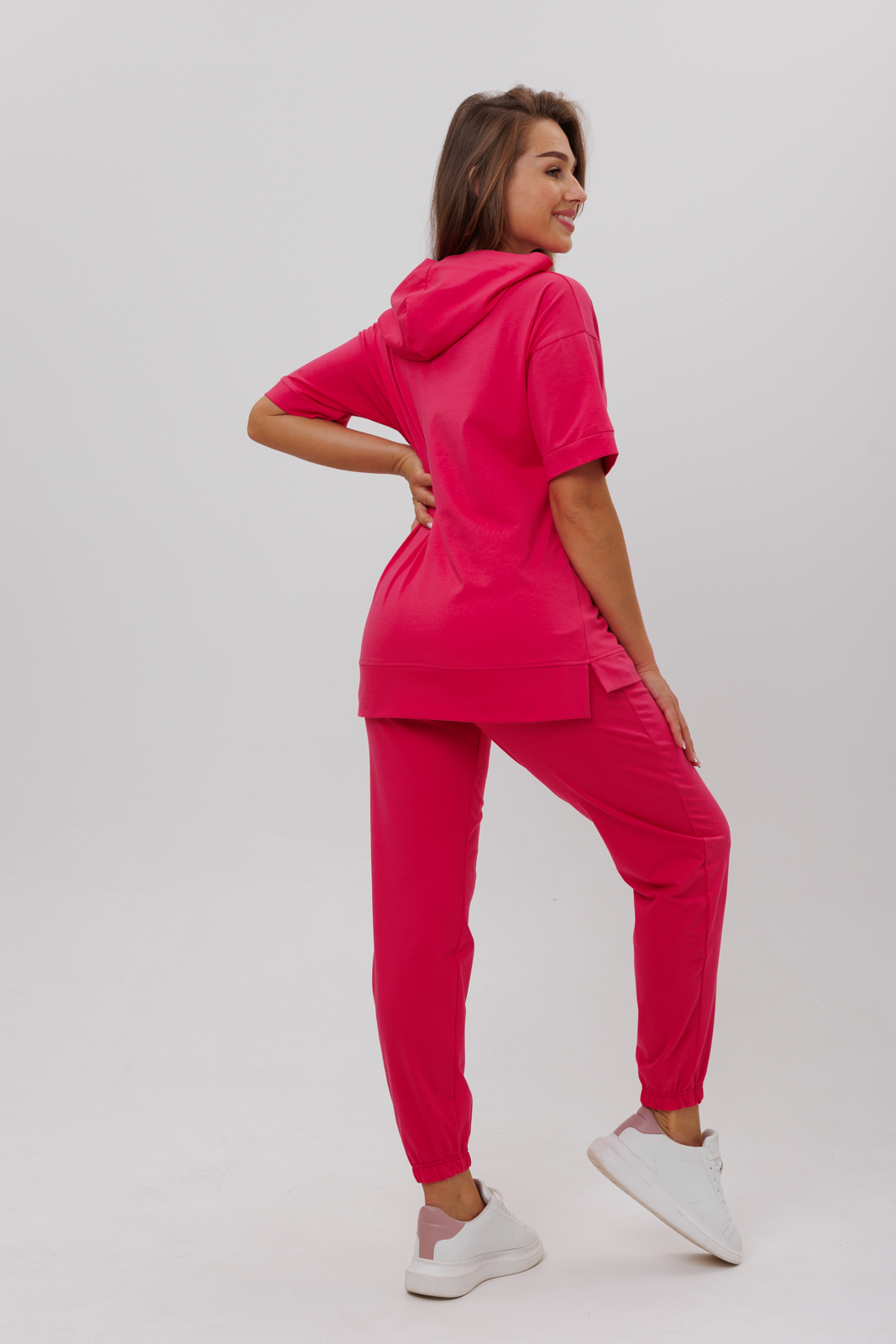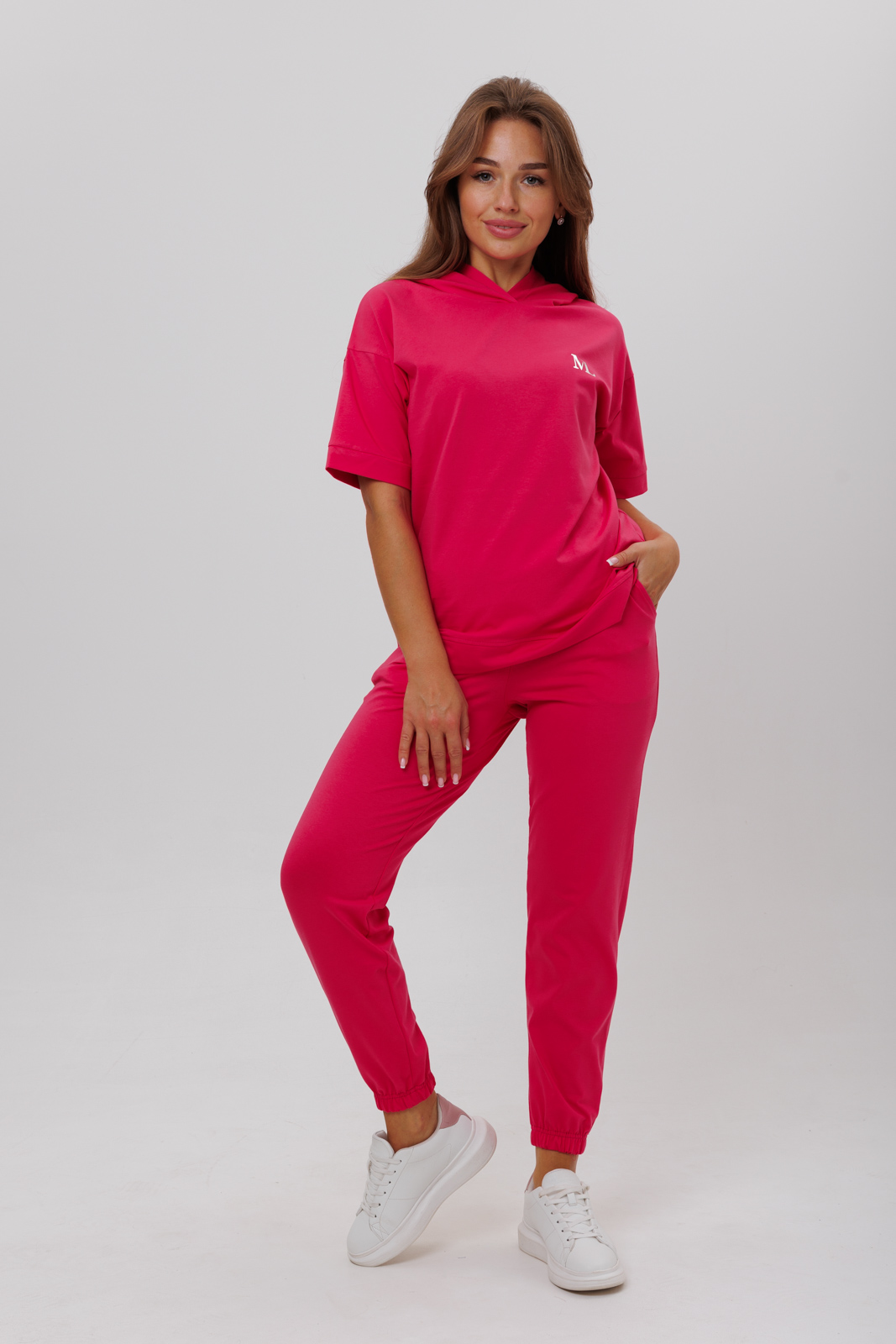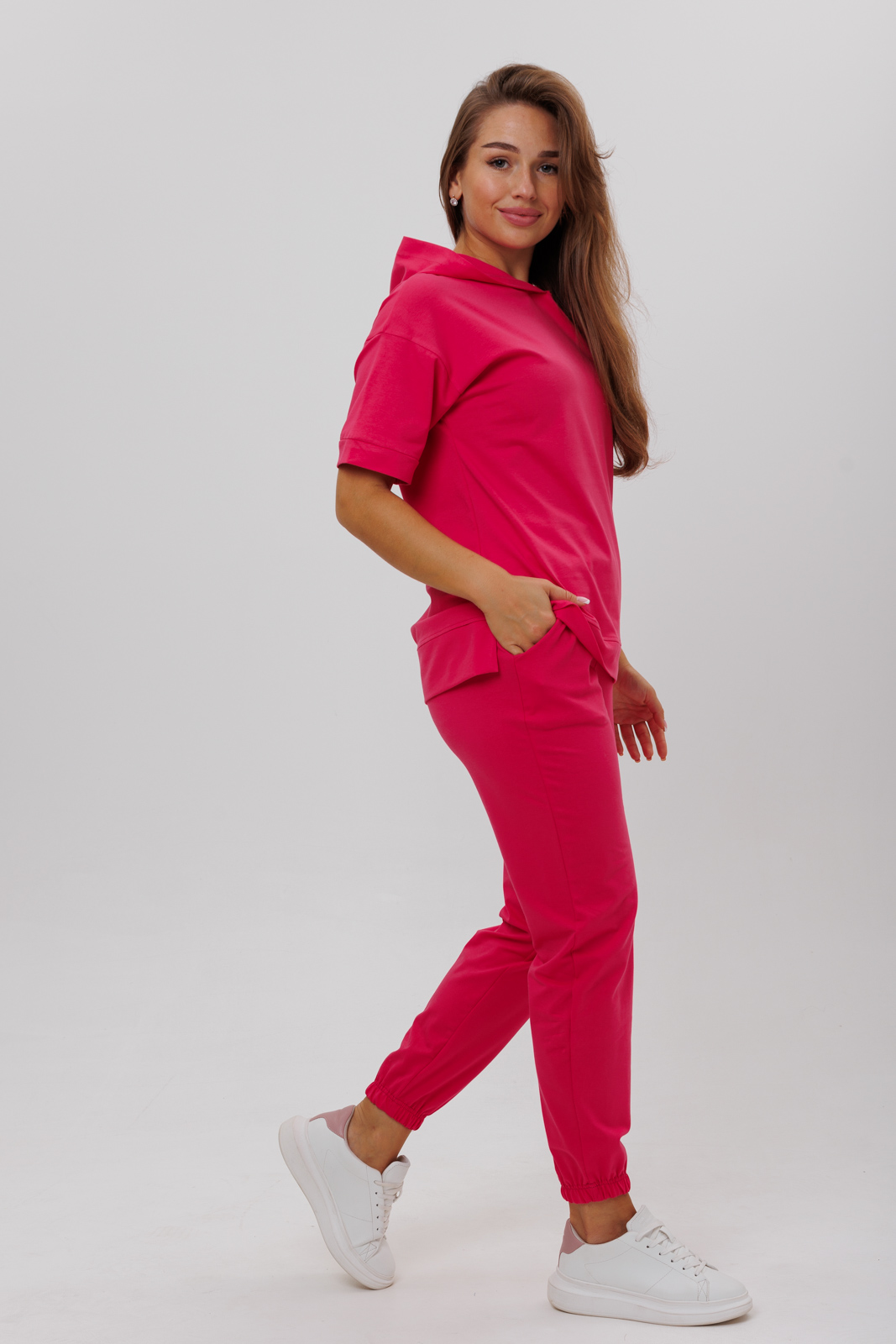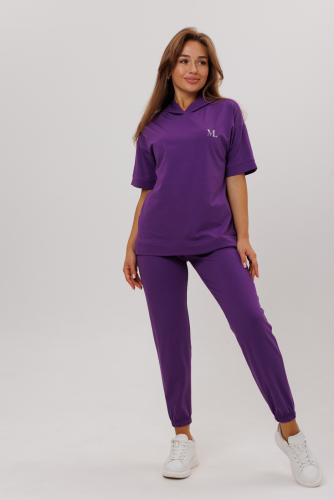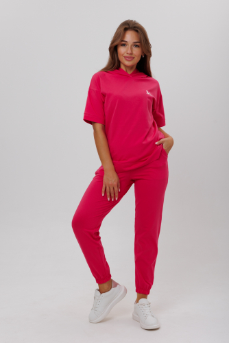 Костюм состоит из футболки с капюшоном и брюк с карманами.