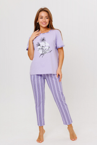 Женский костюм, состоящий из футболки с коротким рукавом и принтом и  свободные брюки с мягкой резинкой и боковыми карманами.