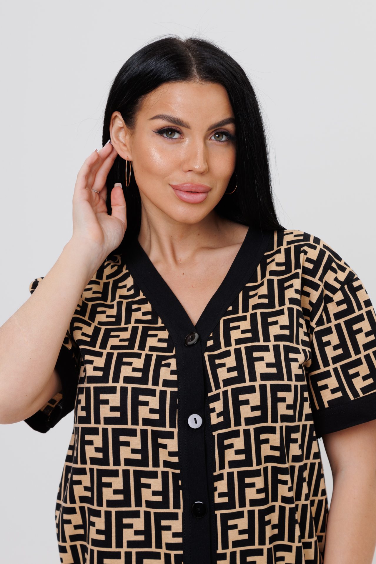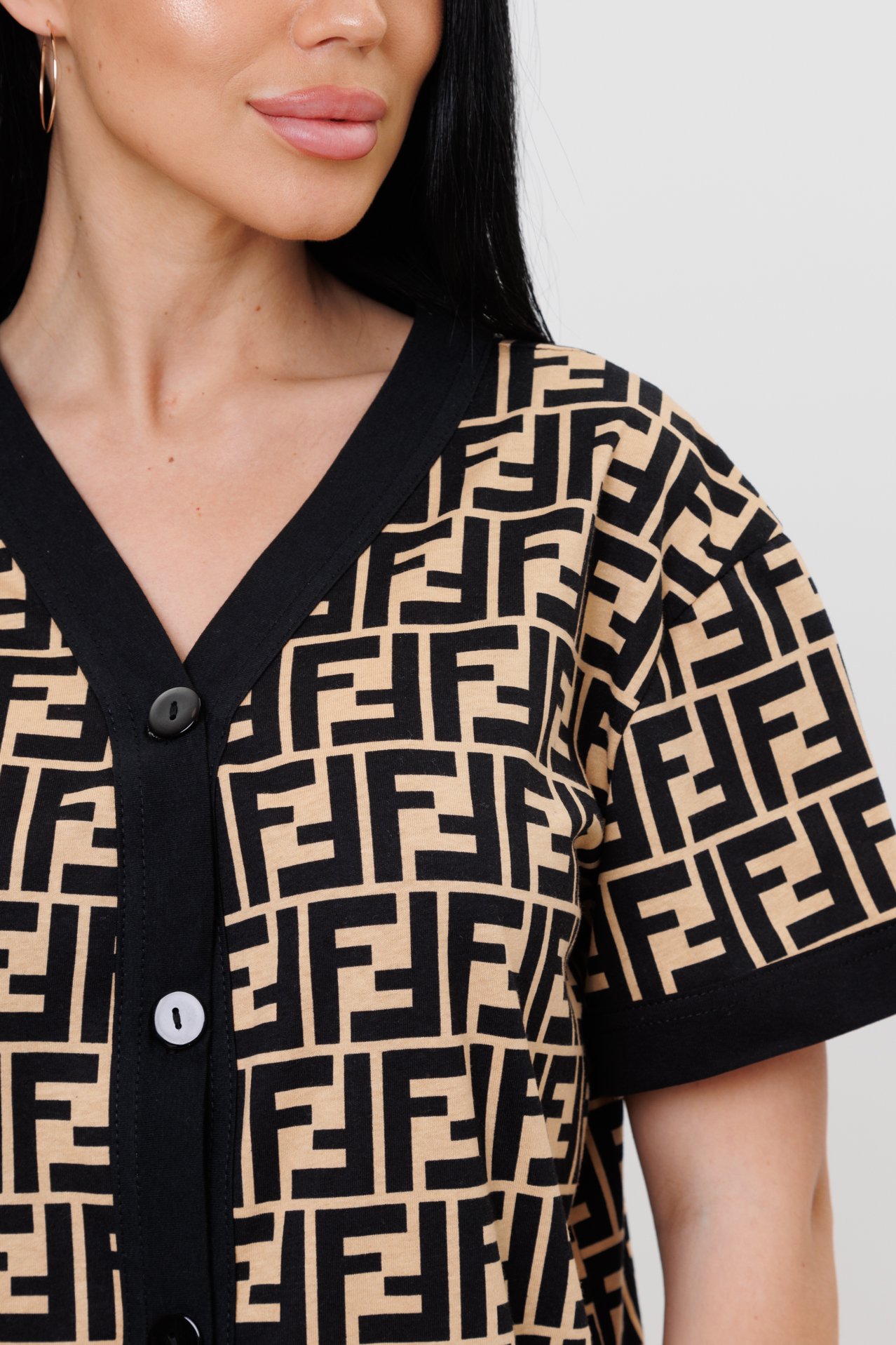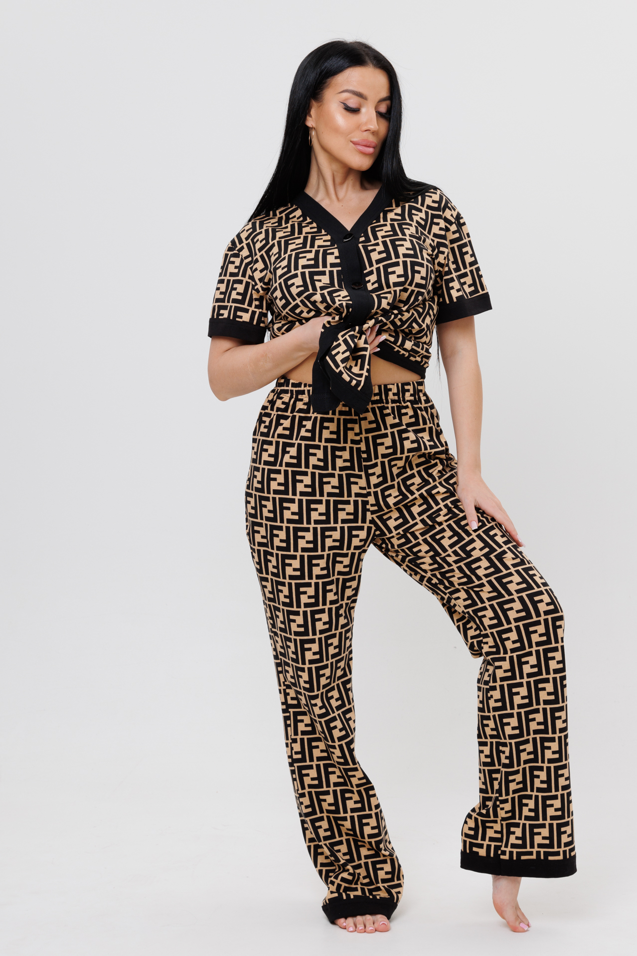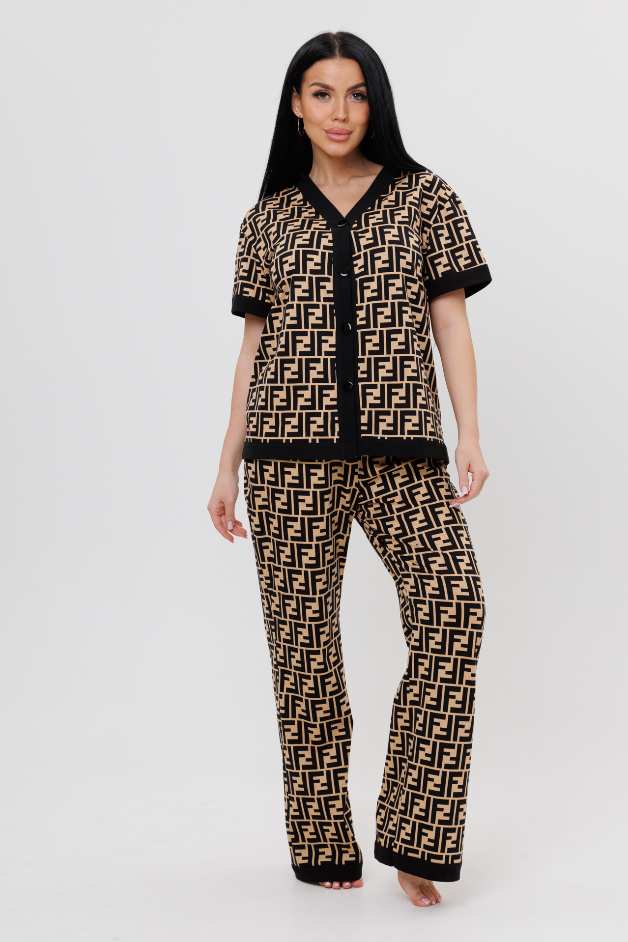 Пижамный костюм – идеальный вариант для любой женщины, независимо от стиля. Он состоит из рубашки и брюк. Костюм сшит из трикотажного полотна 100 % хлопка. Широкие брюки, отделанные книзу манжетами из ткани компаньона, подчеркнут элегантность и изящество фигуры. Рубашка с короткими рукавами с манжетами из ткани компаньона, V-образным вырезом, с пуговицами на планке из ткани компаньона добавит нотку стиля.