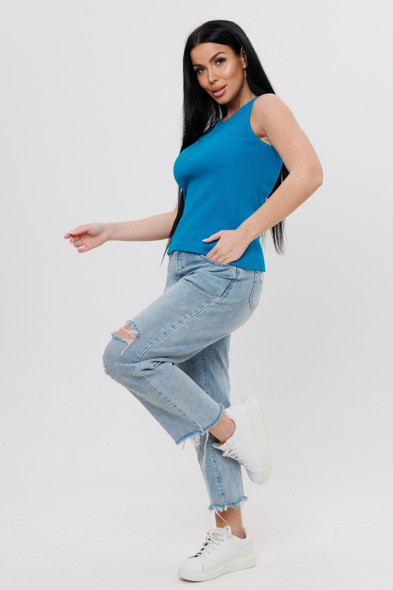 Майка женская сшита из эластичного трикотажа кашкорсе. Майка без рукавов имеет приталенный силуэт, округлый вырез горловины. Приталенная модель подойдет для спорта, отдыха, а также для повседневного ношения. Майка отлично сочетается с джинсами, шортами, юбками. Однотонную базовую майку можно носить  с пиджаком, жакетом, олимпийкой. Майка прекрасно подходит для фитнеса и бега, йоги. Майка изготовлена из хлопкового трикотажа с добавлением лайкры, отлично сохраняет свою форму после множества стирок. Хлопковый трикотаж позволяет коже дышать, хорошо отводит влагу.