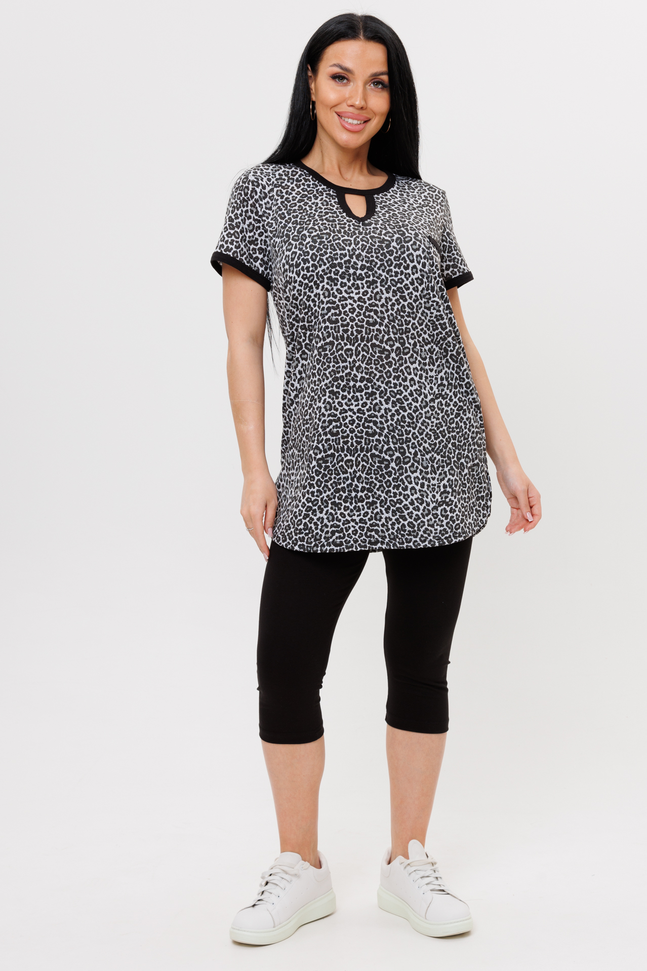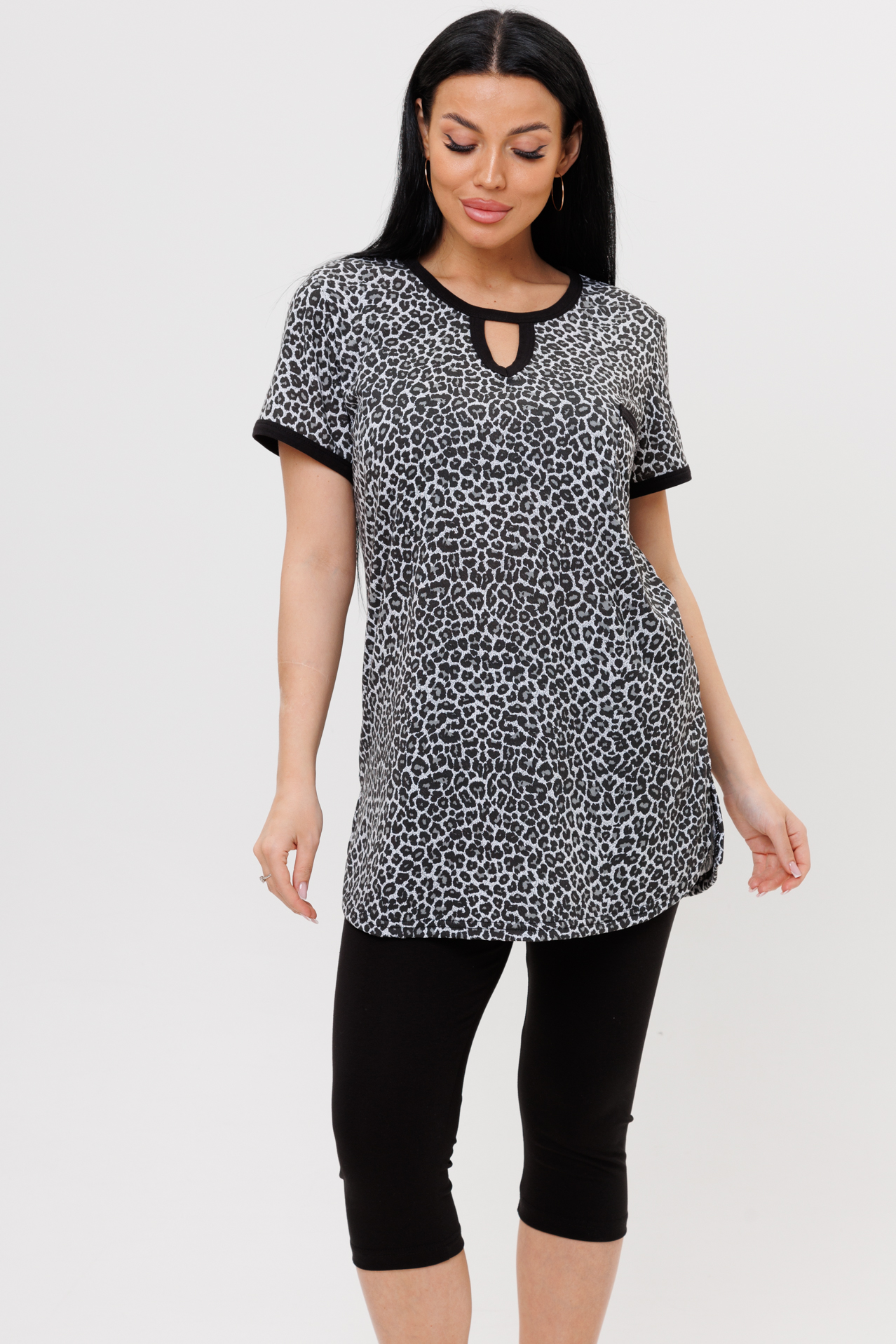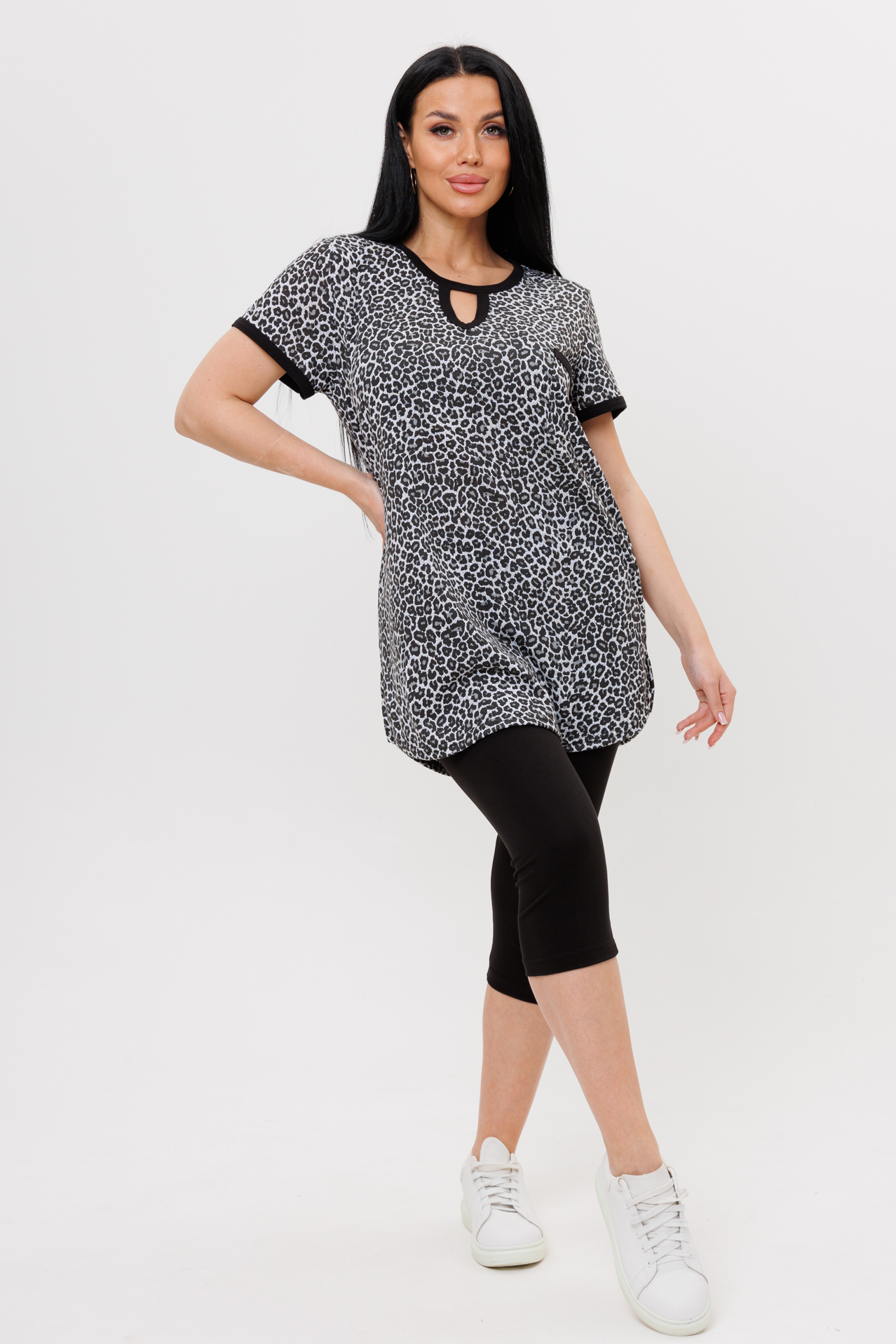 Костюм с бриджами и удлиненной футболкой сшит из хлопкового трикотажа. Футболка с коротким рукавом, с округлым вырезом и капелькой, анималистическим принтом и карманом на груди. Горловина и рукава отделаны кантом из ткани компаньона. Бриджи однотонные, черные, длиной ниже колена.  Женский костюм подойдет для дачи, повседневной носки, для дома и сна.