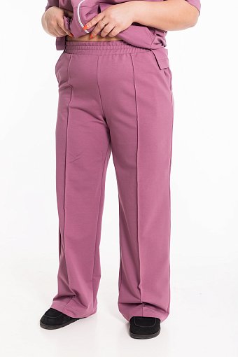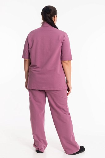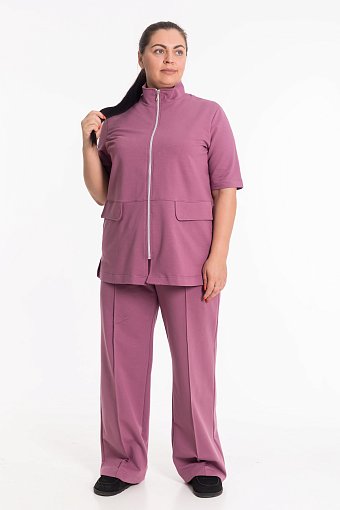 Женский костюм выполнен из однотонного футера с лайкрой и состоит из брюк и рубашки на молнии. Брюки имеют удобный притачной пояс и боковые карманы. Рубашка с воротником-стойкой дополнена горизонтальным подрезом на полочках, от которого начинаются боковые карманы с клапанами. В боковых швах предусмотрены разрезы для комфорта. Рукава длиной до локтя делают образ стильным и практичным.