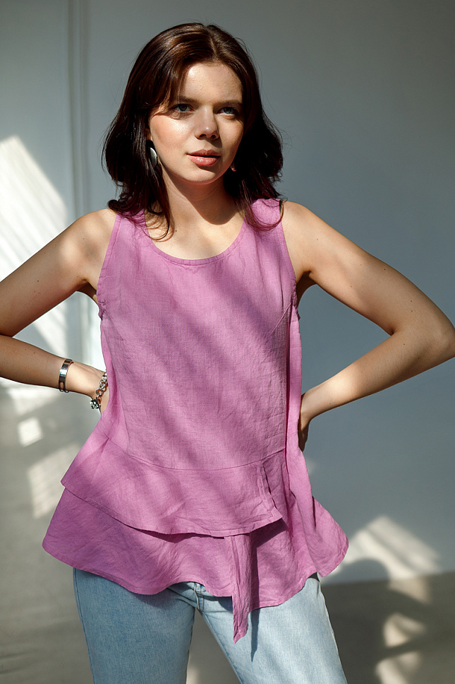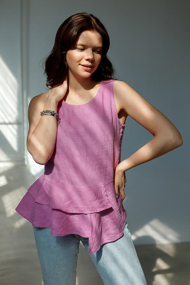Блузы с баской уже давно «штурмуют» модные показы, и как итог – смогли занять почётное место в женских гардеробах. Такое явление вполне обоснованно. Такие блузы – универсальный вариант для женщин любого возраста и телосложения. Дизайнеры марки Kayros представляют вам интерпретацию на эту тему. Великолепная блуза изо льна создаёт кокетливый и нежный образ по средствам отрезной баски по талии. Ассиметричные многоярусные воланы прекрасно подчёркивают женскую талию и округлую линию бёдер. Теперь переведём свой взгляд на лиф модели. Он лишён каких – либо декоративных изысков: круглый вырез горловины и отсутствие рукавов, линия плеча открыта. Всё внимание сосредоточено на баске. Но такой минимализм в декоре даёт возможность поэкспериментировать с различными аксессуарами и бижутерией. Ничего не будет лишним. Всё зависит от ваших вкусовых пристрастий и ситуации, для которой предполагается данная блуза.