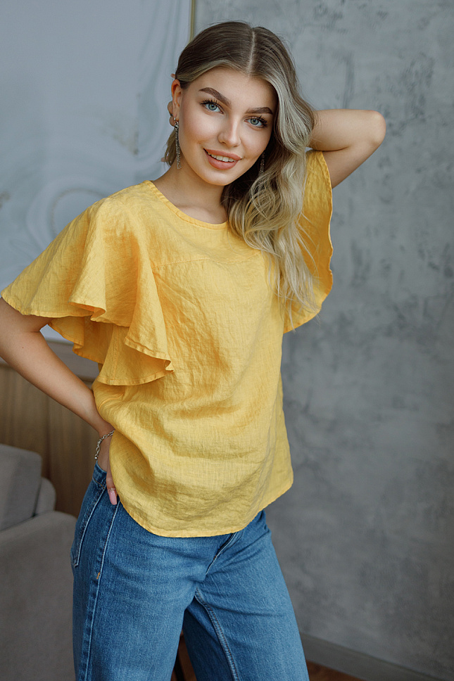 Воланы это всегда волнительно и притягательно. Они всегда в центре внимания окружающих. Женщины очень умело пользуются этим «оружием». Поэтому каждый раз при выборе одежды отдают предпочтение моделям с этими элементами. И на этот раз дизайнеры порадовали прекрасную половину человечества кокетливыми воланами. Обратите внимание на представленную модель блузы! Прямой свободный крой дарит массу комфорта, скрывая все несовершенства фигуры. Лишённая какого- либо декора – блуза лаконична и проста в своём исполнении. Неброская кокетка на полочке – как конструктивный элемент. Всё внимание обращено к рукавам – воланам, которые спадают волной, образуя струящийся силуэт. Такое конструктивное решение подчёркивает красоту и утончённость женских рук. Удивляет, как подобная задумка прекрасно реализована по средствам натурального льна, который препятствует созданию струящихся форм. Жатая текстура и припылённые оттенки модели создают блузу на каждый день.