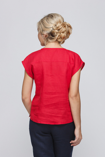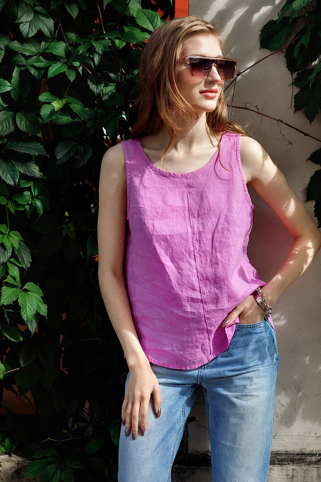 Если вам наскучил трикотаж, во всех его проявлениях?! С его предательским обтягиванием тела, закатыванием волокон и синтетическим содержанием нитей. Вам стоит переключить своё внимание на что-то более благородное и «приятное»! Мы готовы вам подсказать – это лён! Лён не только натуральный и дышащий материал. Одежда из льна способна нейтрализовать неприятные запахи, она является натуральным антисептиком, доставляя комфорт и удобство. Теперь, мы уверены, вас заинтересует представленная модель блузы из натурального льна! Прямой силуэт лаконичен и функционален. Прекрасно «сидит» на фигуре, не обтягивая недостатки, и хорошо встраивается в дуэты с другими плечевыми изделиями в качестве внутреннего слоя. Скруглённый нижний срез позволяет стильно носить блузу поверх поясных изделий. Широкая бретель и круглый вырез горловины – излюбленная классика у девушек и женщин, которая практична в жаркие дни. Минимализм в декоре позволяет в полной мере насладиться красотой текстуры натурального льна.