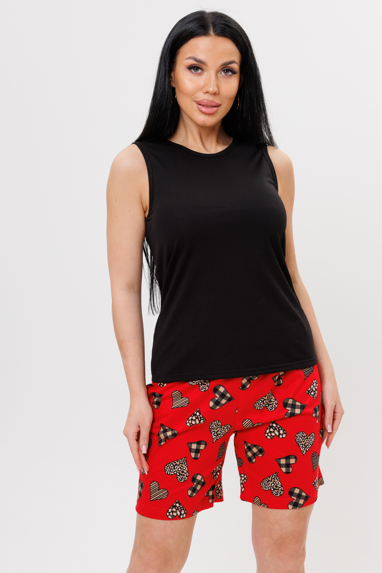 Женская пижама сшита из хлопкового полотна. Комплект выполнен в молодежном стиле и состоит из майки и шорт. Майка сшита из трикотажного полотна кулирки с добавлением лайкры, благодаря чему она практически не тянется в длину и плотно облегает тело, подчеркивая все его достоинства.  Округлая горловина и проймы отделаны кантом в тон основного цвета майки. Прямые шорты на мягкой широкой эластичной резинке сшиты из ткани компаньона 100 % хлопка с оригинальным принтом.