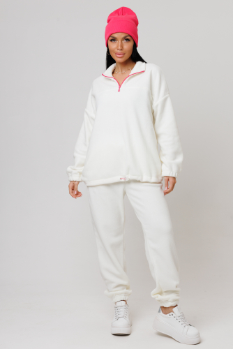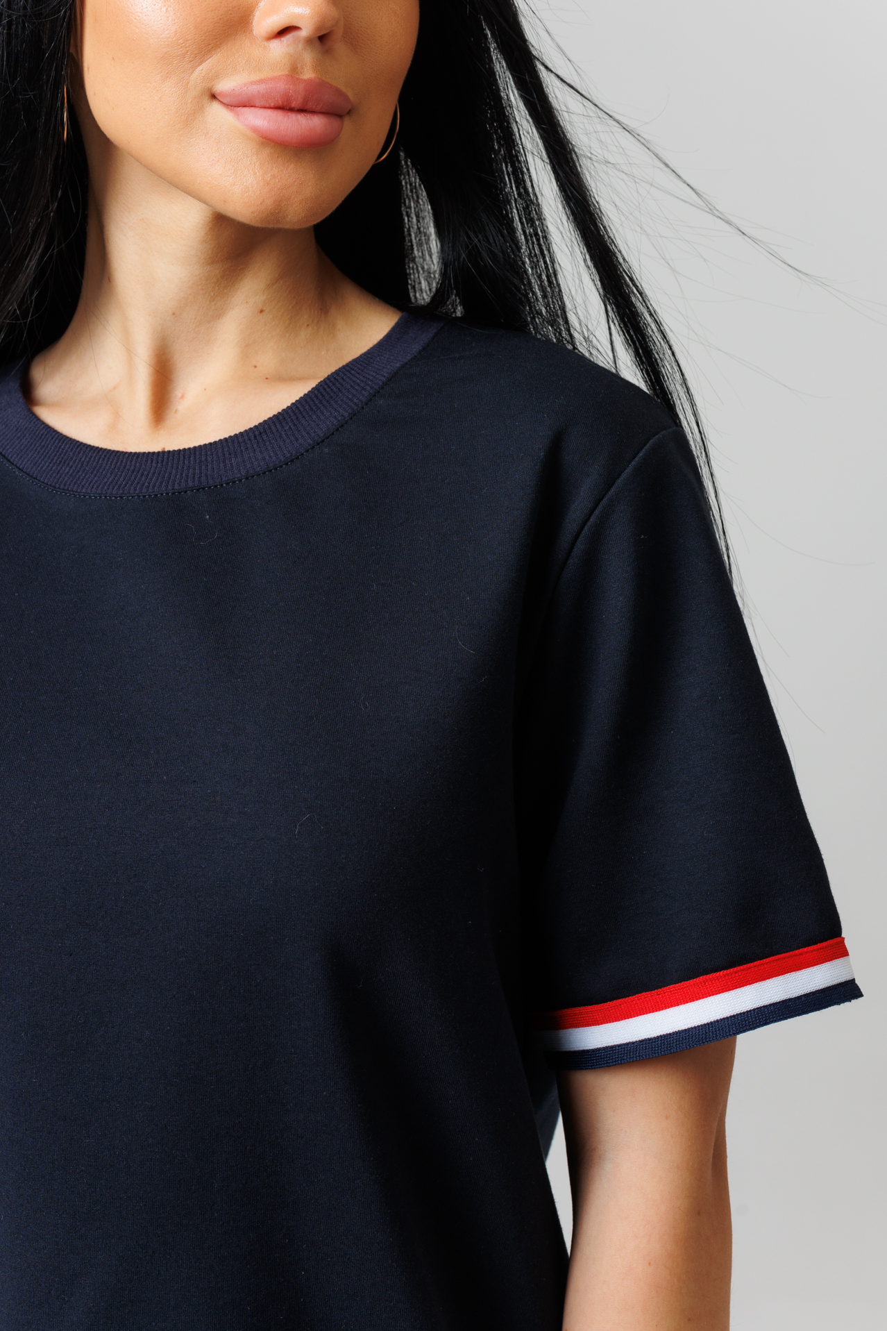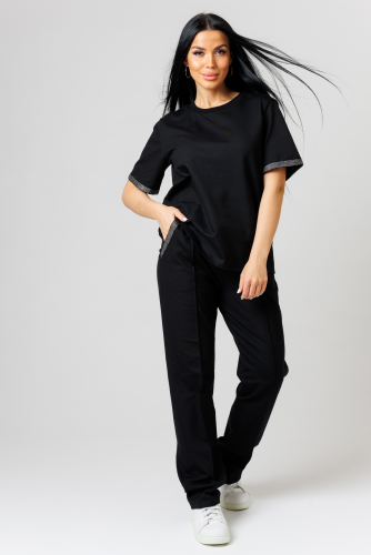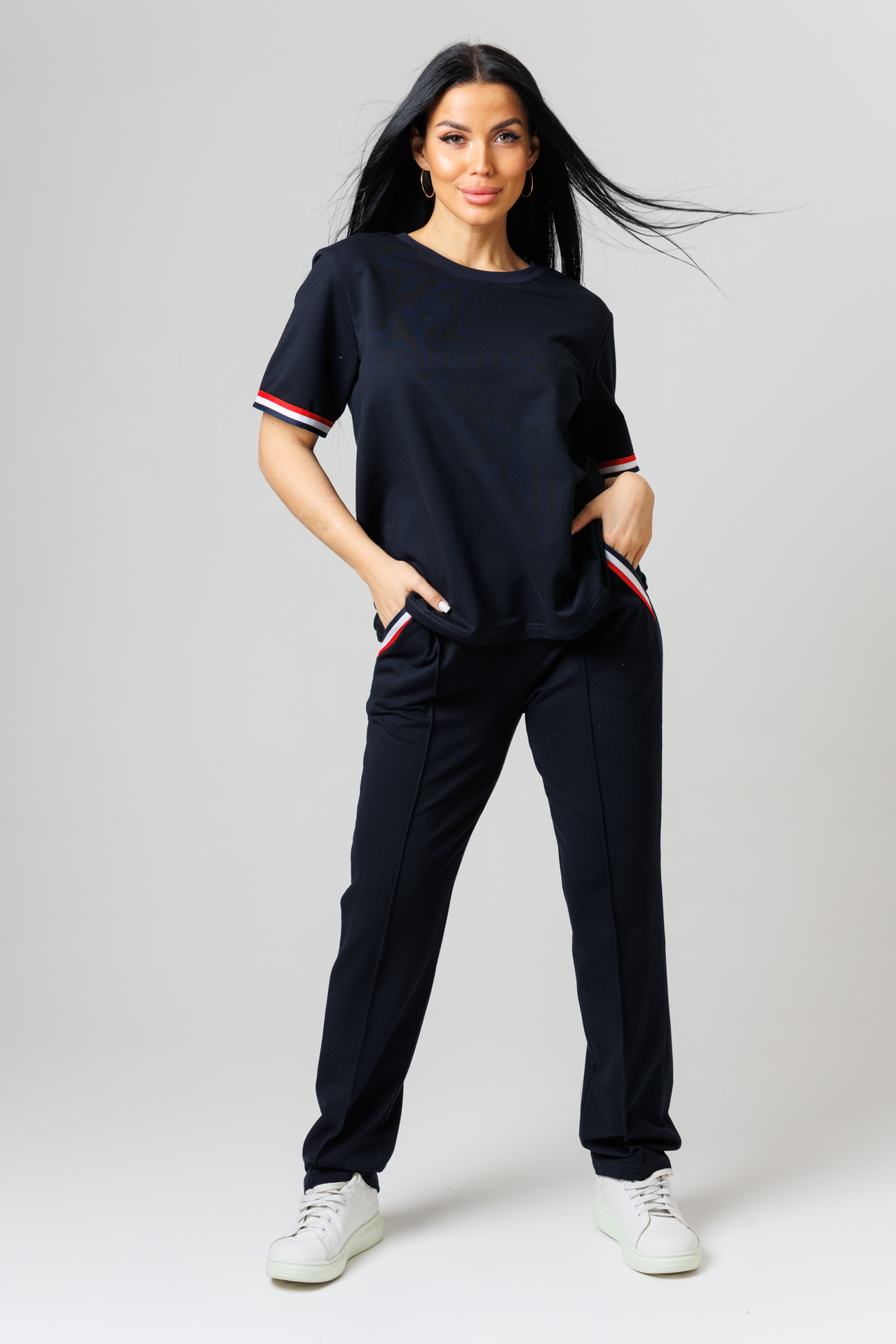 Женский костюм с брюками выполнен из трикотажного полотна. Костюм состоит футболки и брюк. Умерено свободная футболка имеет округлый вырез, короткие втачные рукава декорированные трикотажной вязаной тесьмой. Брюки прямые с фиксированными стрелками и боковыми карманами. Карманы на брюках отделаны трикотажной вязаной тесьмой. Стильный легкий модный костюм с брюками идеально походит для тренировок, дома, офиса, прогулок и путешествий.  Он сшит по универсальным лекалам, которые позволяют скрывать все недостатки фигуры и выгодно подчеркнуть ее достоинства.