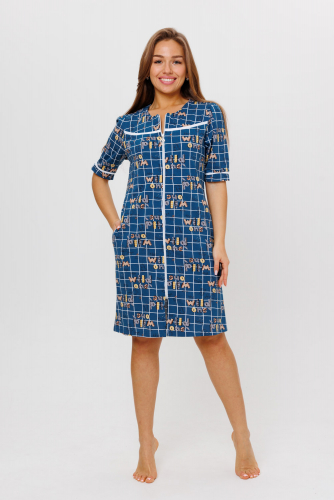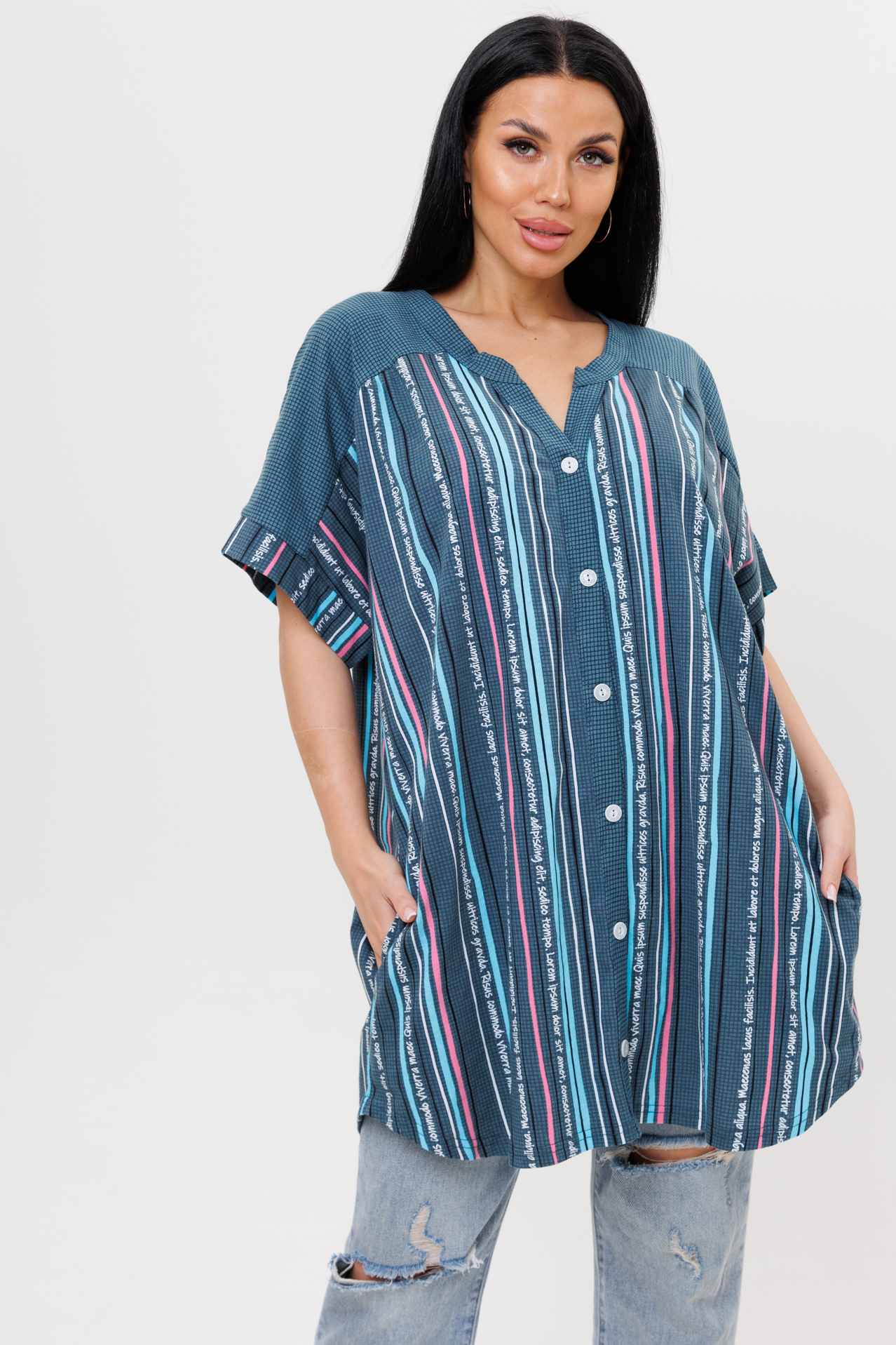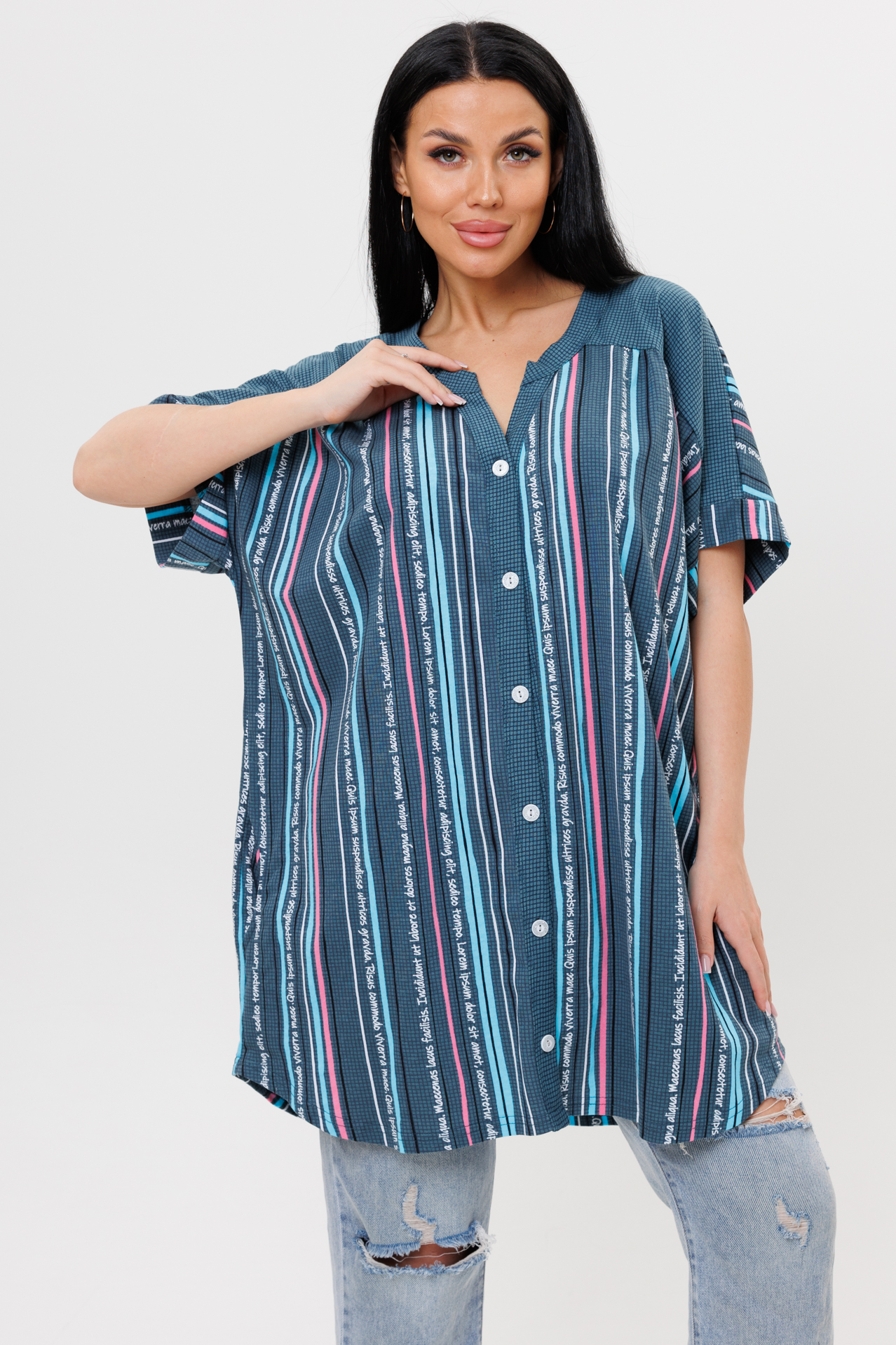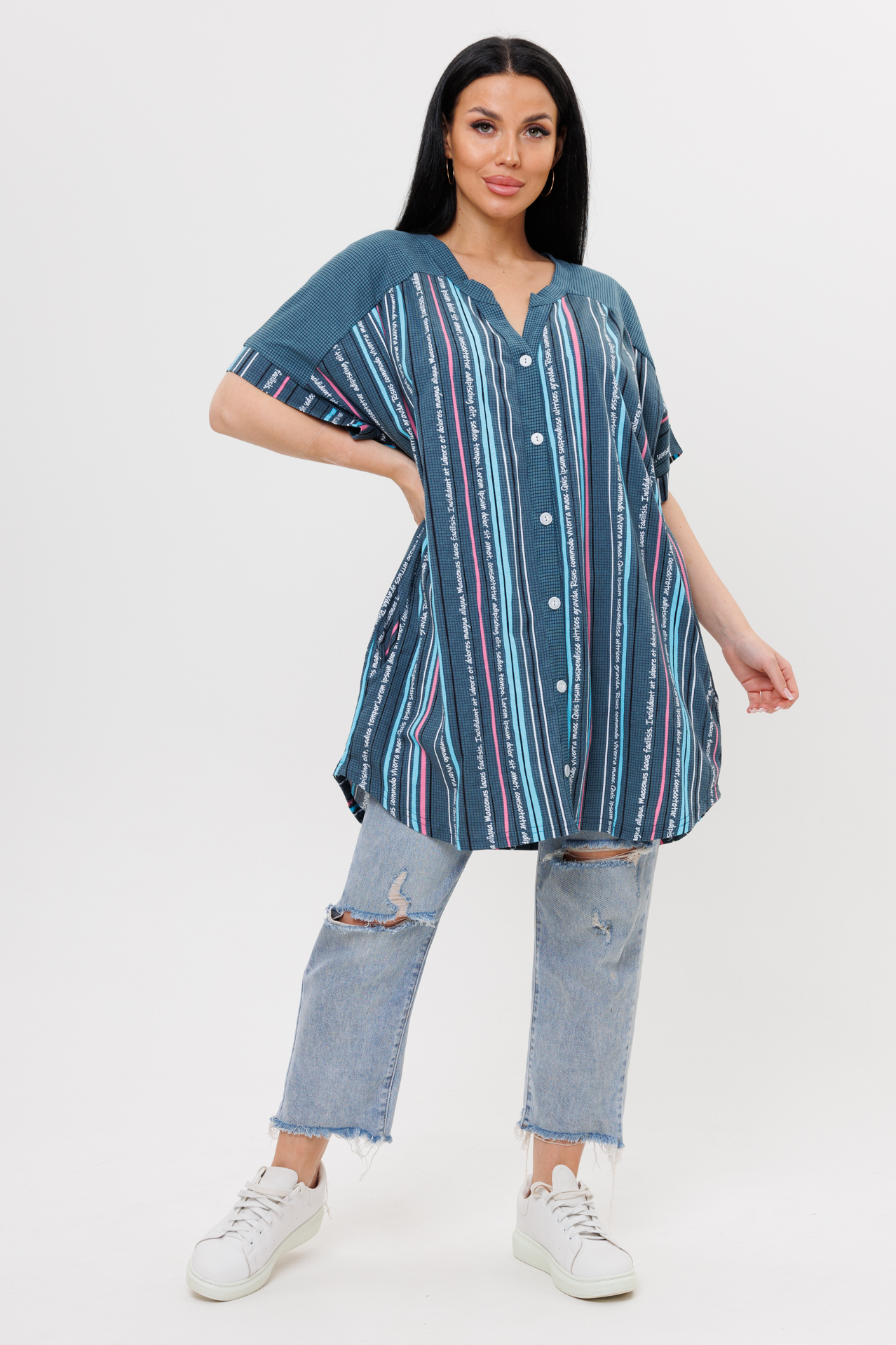 Стильная туника прямого силуэта сшита из натурального хлопка. Ткань гигроскопична и быстро сохнет. Туника имеет свободный силуэт, округлую горловину с V-образным вырезом, переходящий в планку на пуговицах, выполненную из ткани компаньона. Цельнокроеный короткий рукав подчеркивает манжета в тон основной ткани. Рукав отделан кокеткой из ткани компаньона. Удлиненная трикотажная туника подойдет как для дома, офиса и отдыха, а также для беременных.