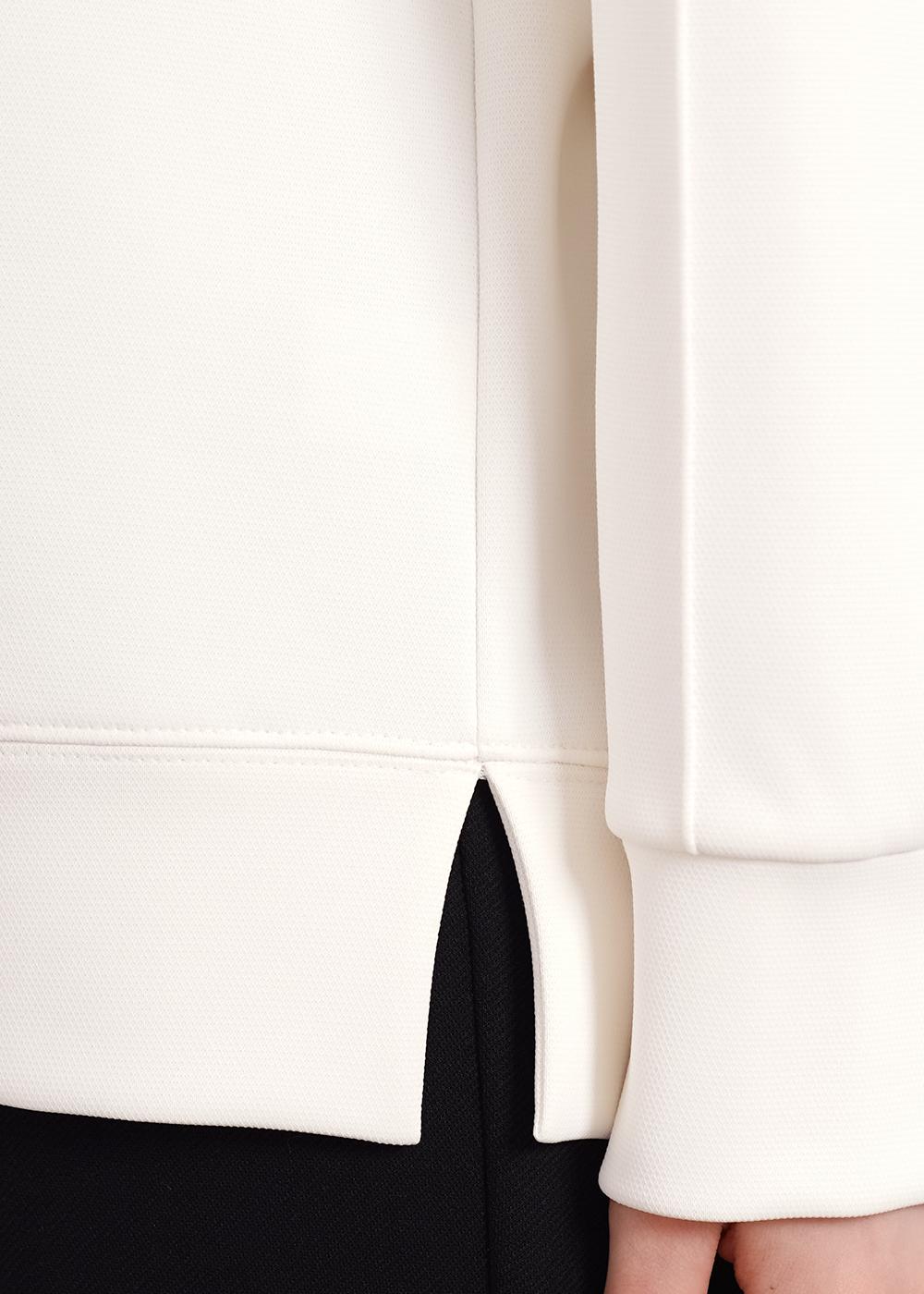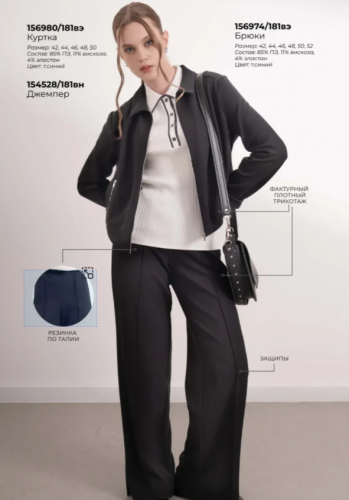 "Описание: Джемпер из трикотажного полотна джерси фактурное, свободного кроя. Округлая горловина с обтачкой. Длинный рукав со спущенной линией плеча, по низу манжеты. По переду декоративные защипы. По низу изделия манжет с боковыми разрезами.