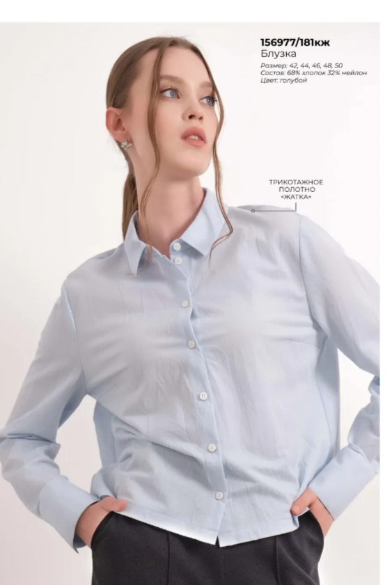 "Описание: Блузка прямого силуэта из трикотажного полотна, с отложным воротником на стойке. Спереди цельнокроеная планка с застежкой на пуговицы. Длинный втачной рукав, внизу с притачной манжетой и застежкой на пуговицу. По спинке кокетка со складкой.