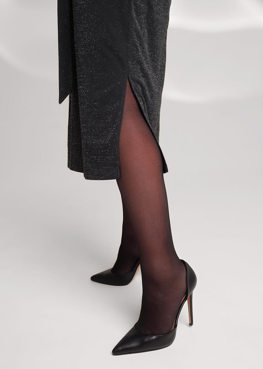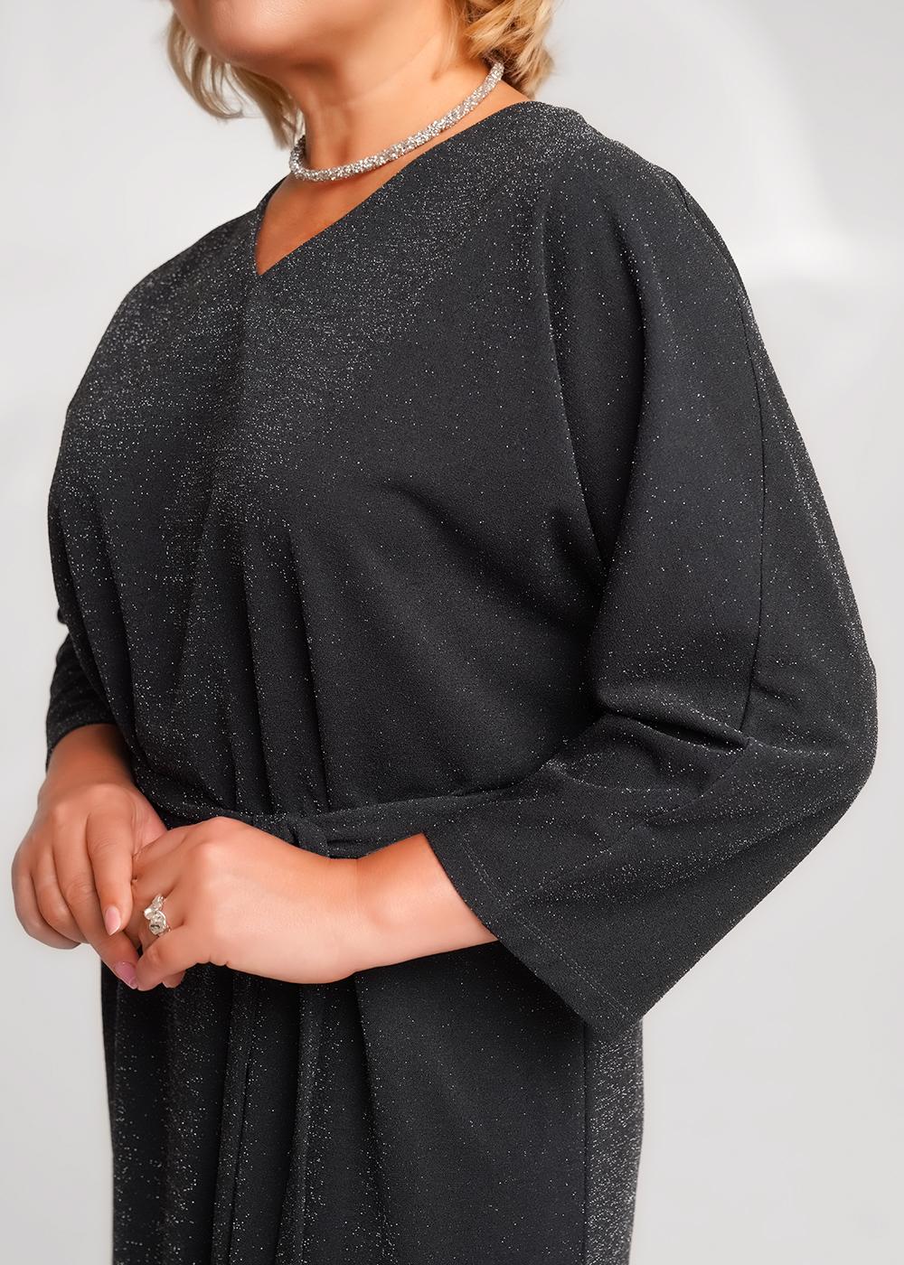 "Описание: Платье свободного силуэта из трикотажного полотна с блеском. V-образная горловина с внутренней обтачкой. Цельновыкроеный рукав длиной 7/8. По спинке средний шов. Боковые разрезы. Сьемный пояс.