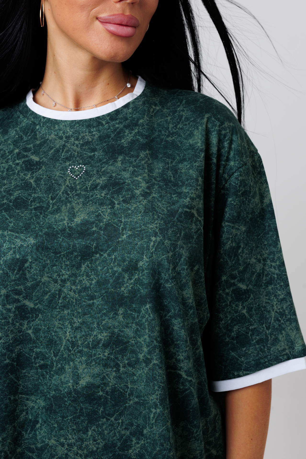 Новинка - модный, красивый костюм в стиле оверсайз с принтом и эффектом варенки, состоит из футболки и брюк свободного силуэта. Спущенный рукав. Двойная обтачка горловины, отделка на рукавах. На груди аппликация из страз, придает образу изюминку. Брюки в спортивном стиле на резинке, с карманами.